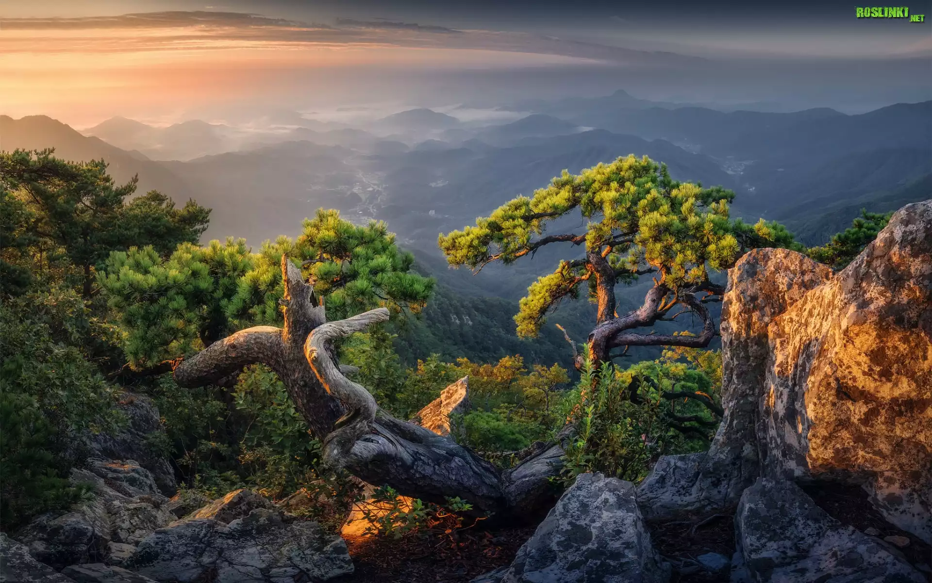 Rośliny: Góry, Skały, Drzewa, Sosny, Kamienie, Chmury, Wschód słońca