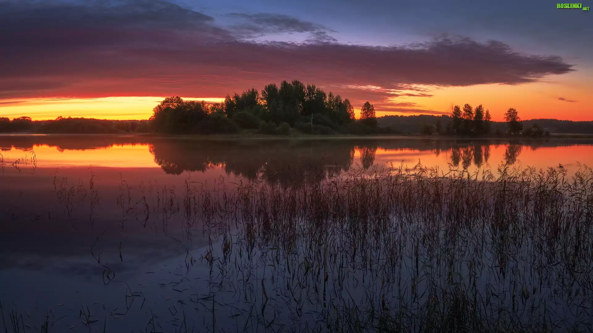 Rośliny: Zachód słońca, Drzewa, Jezioro, Trawa