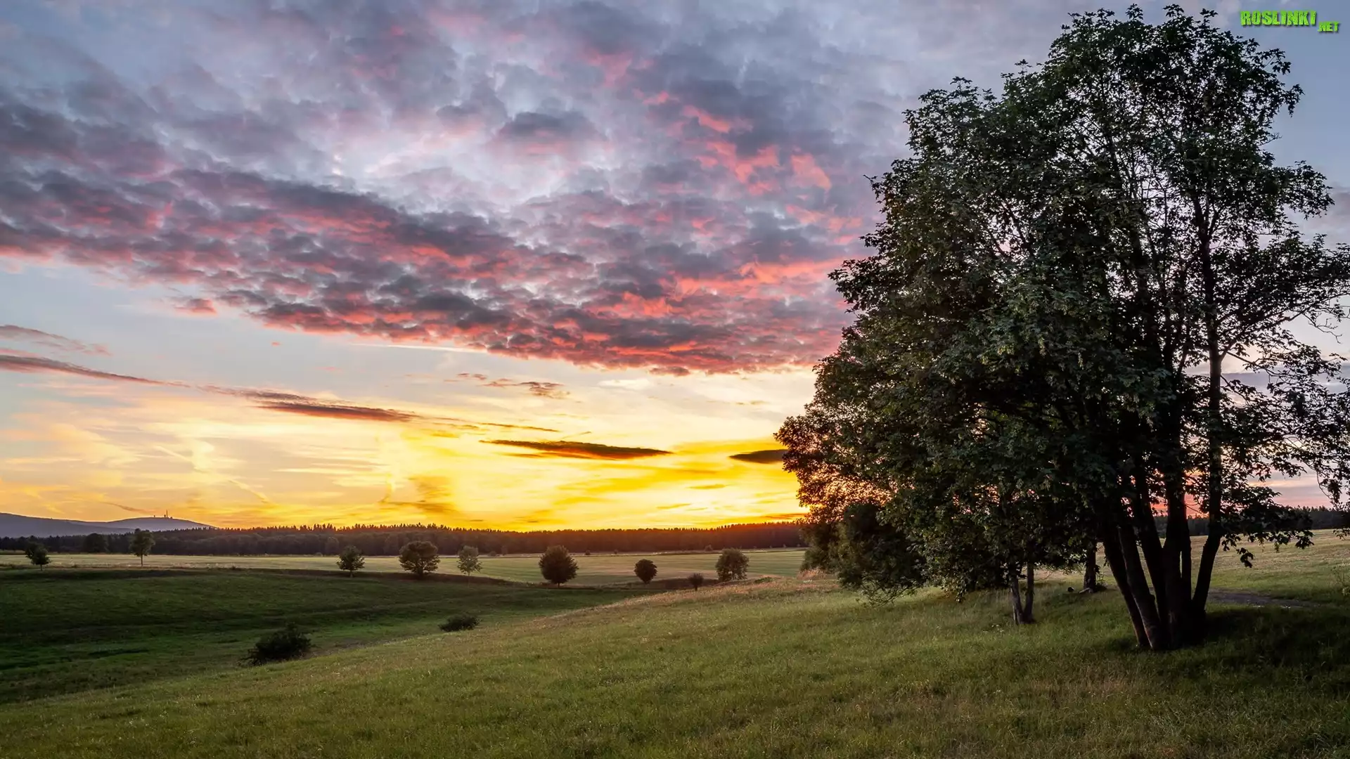 Rośliny: Łąki, Drzewa, Wschód słońca, Chmury