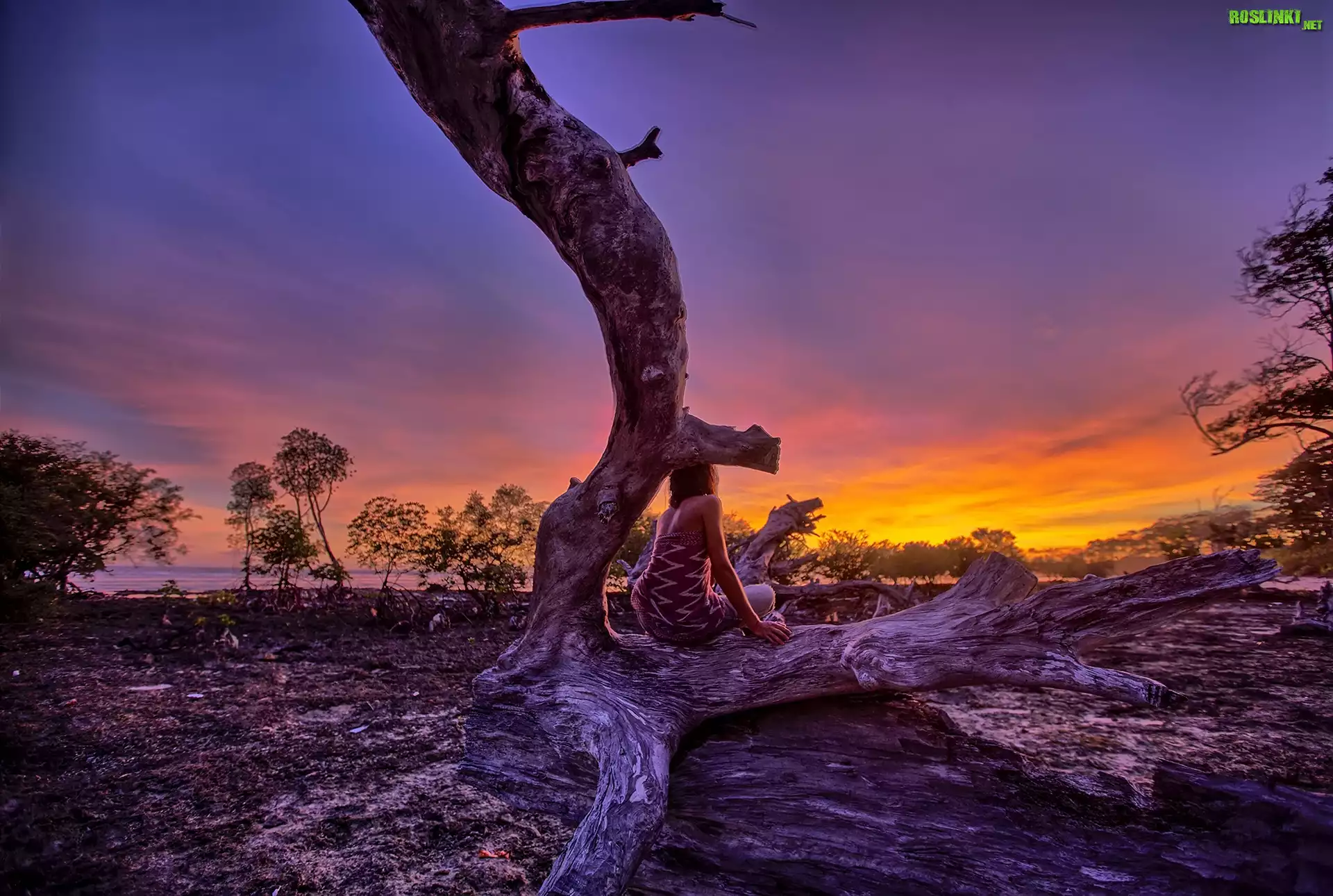 Rośliny: Zachód, Słońca, Kobieta, Siedząca, Na, Suchym, Konarze, Drzewa