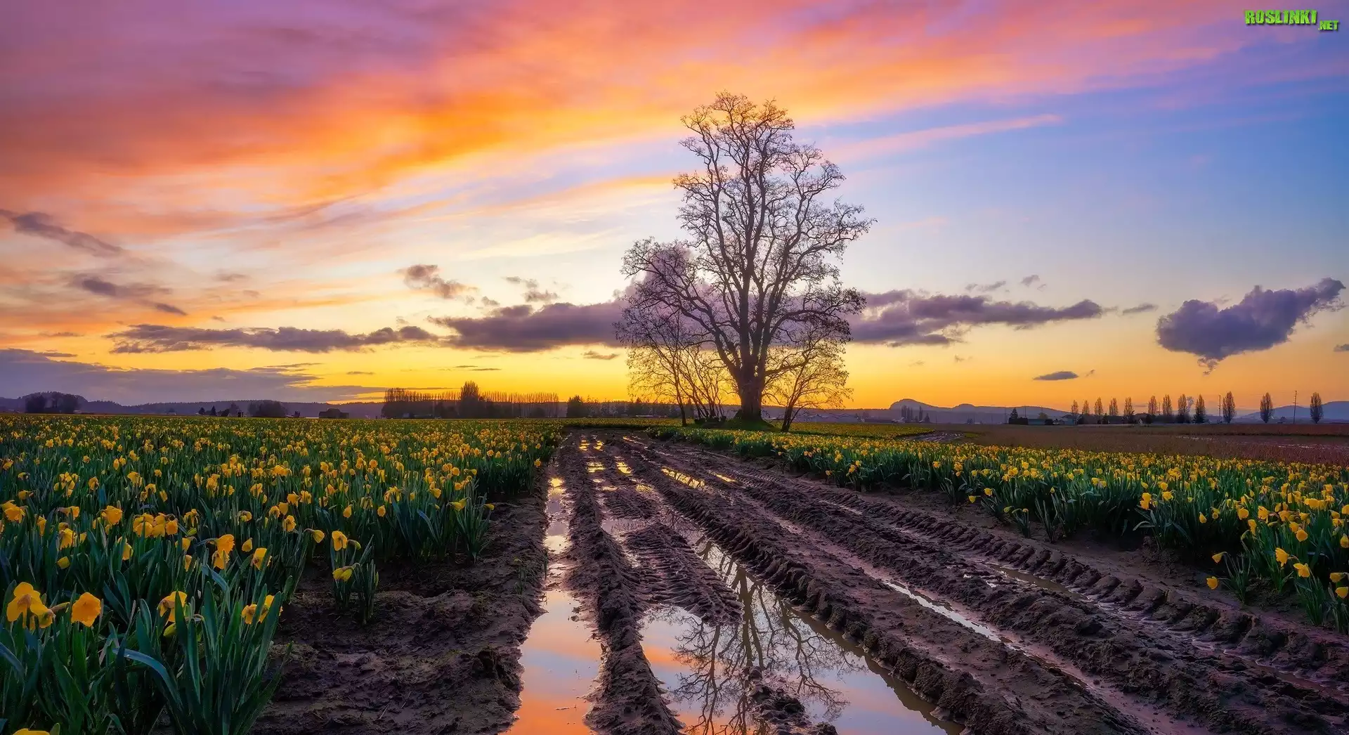 Rośliny: Plantacja, Żółte, Narcyzy żonkile, Drzewo, Błotnista, Droga, Chmury, Zachód słońca