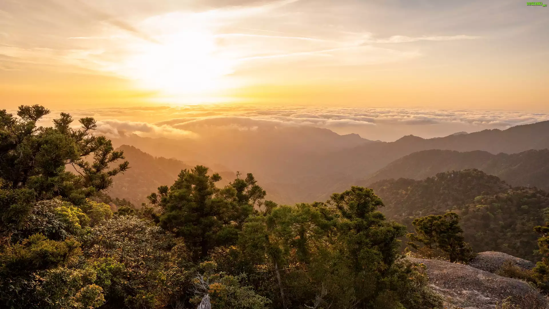 Rośliny: Wschód słońca, Góry, Drzewa, Chmury