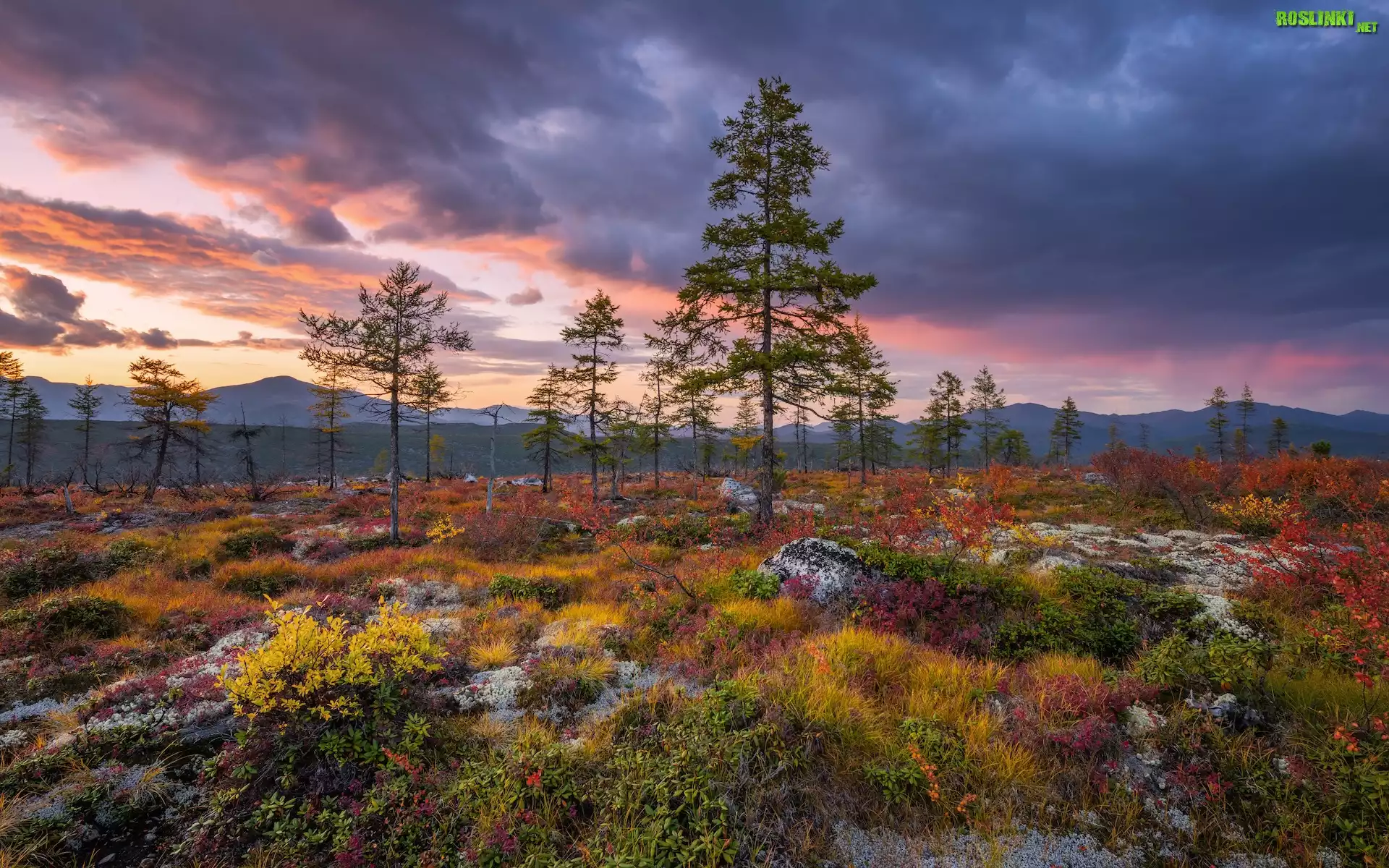 Rośliny: Rosja, Kołyma, Jesień, Drzewa, Roślinność, Góry, Zachód słońca