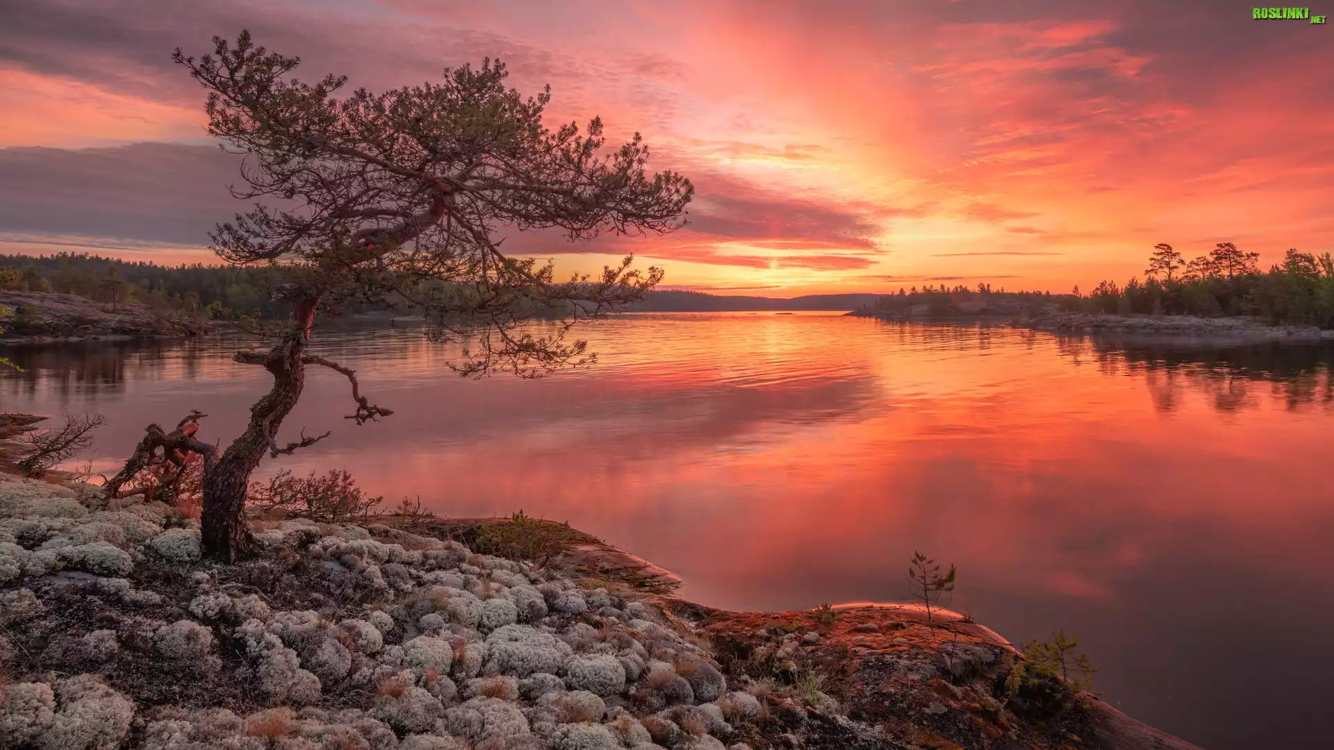 Rośliny: Rosja, Karelia, Jezioro, Ładoga, Skała, Drzewa, Zachód słońca