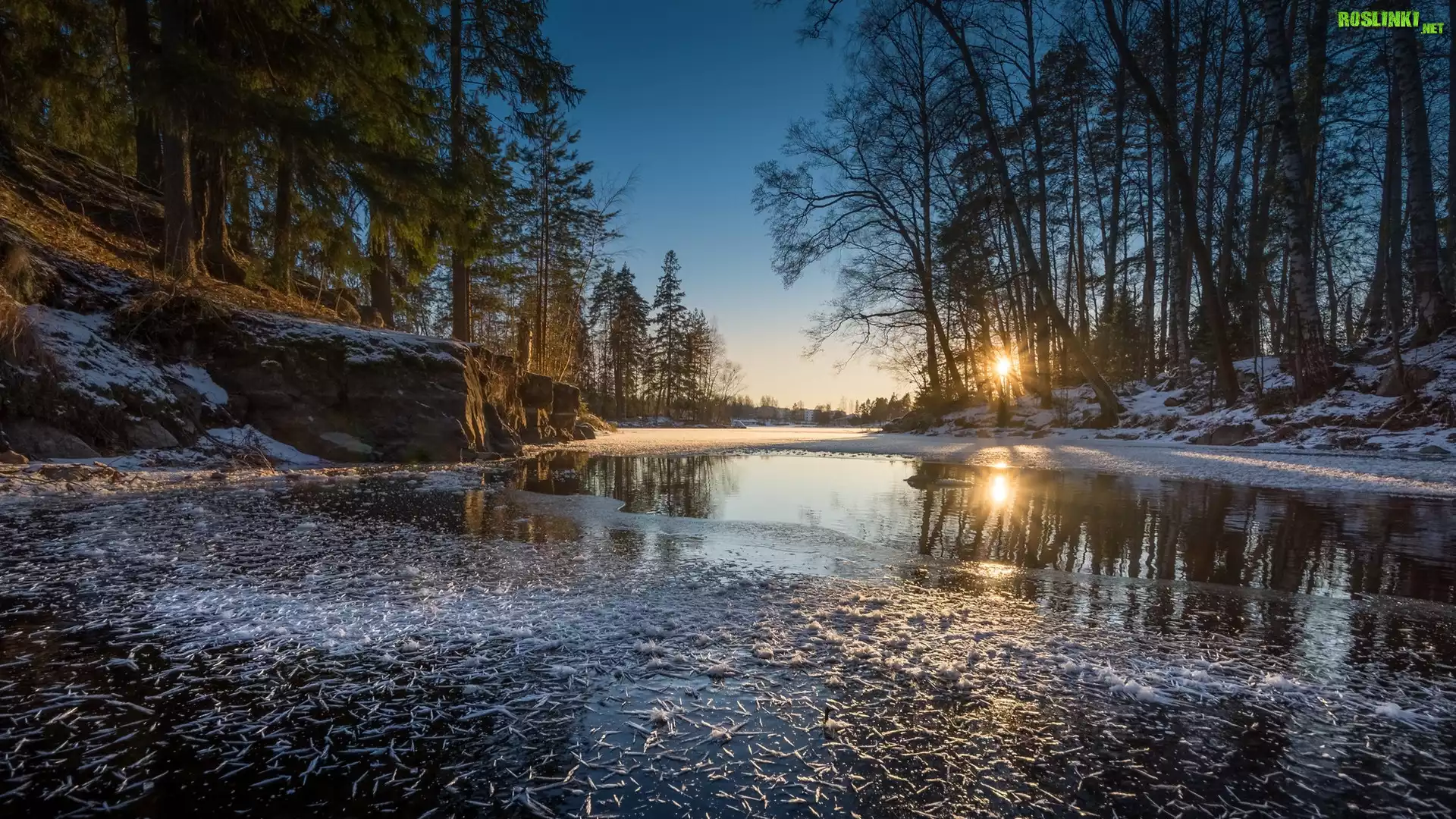 Rośliny: Finlandia, Region Pirkanmaa, Valkeakoski, Kanał, Zima, Rzeka, Drzewa, Promienie słońca