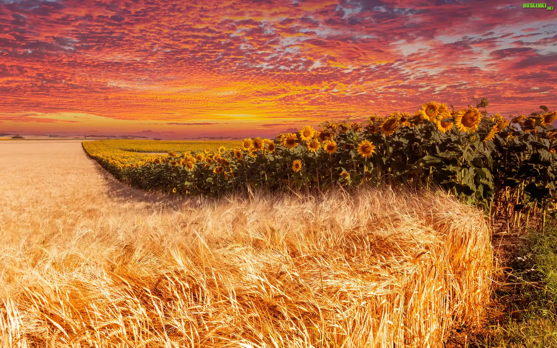 Rośliny: Pole, Zboże, Kłosy, Kwiaty, Słoneczniki, Plantacja, Chmury, Zachód słońca