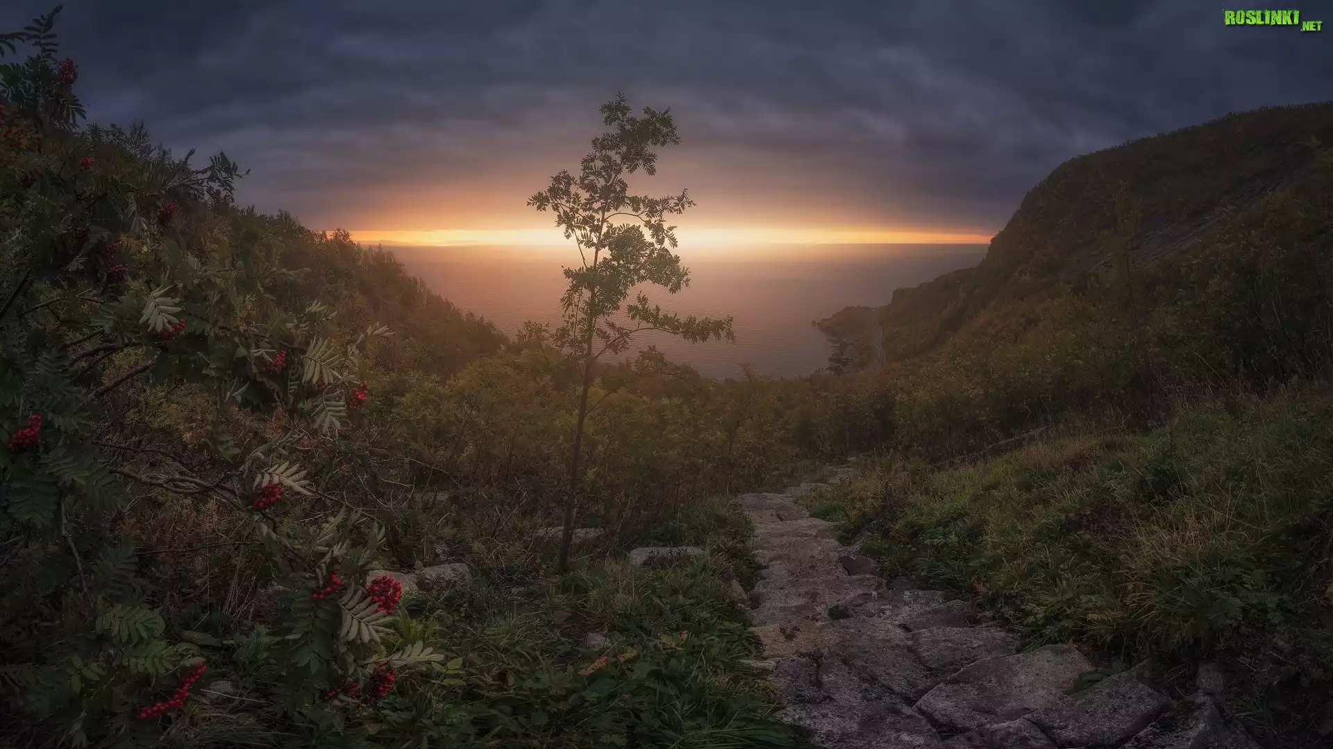 Rośliny: Drzewa, Jarzębina, Krzewy, Ścieżka, Góry, Morze, Chmury, Zachód słońca
