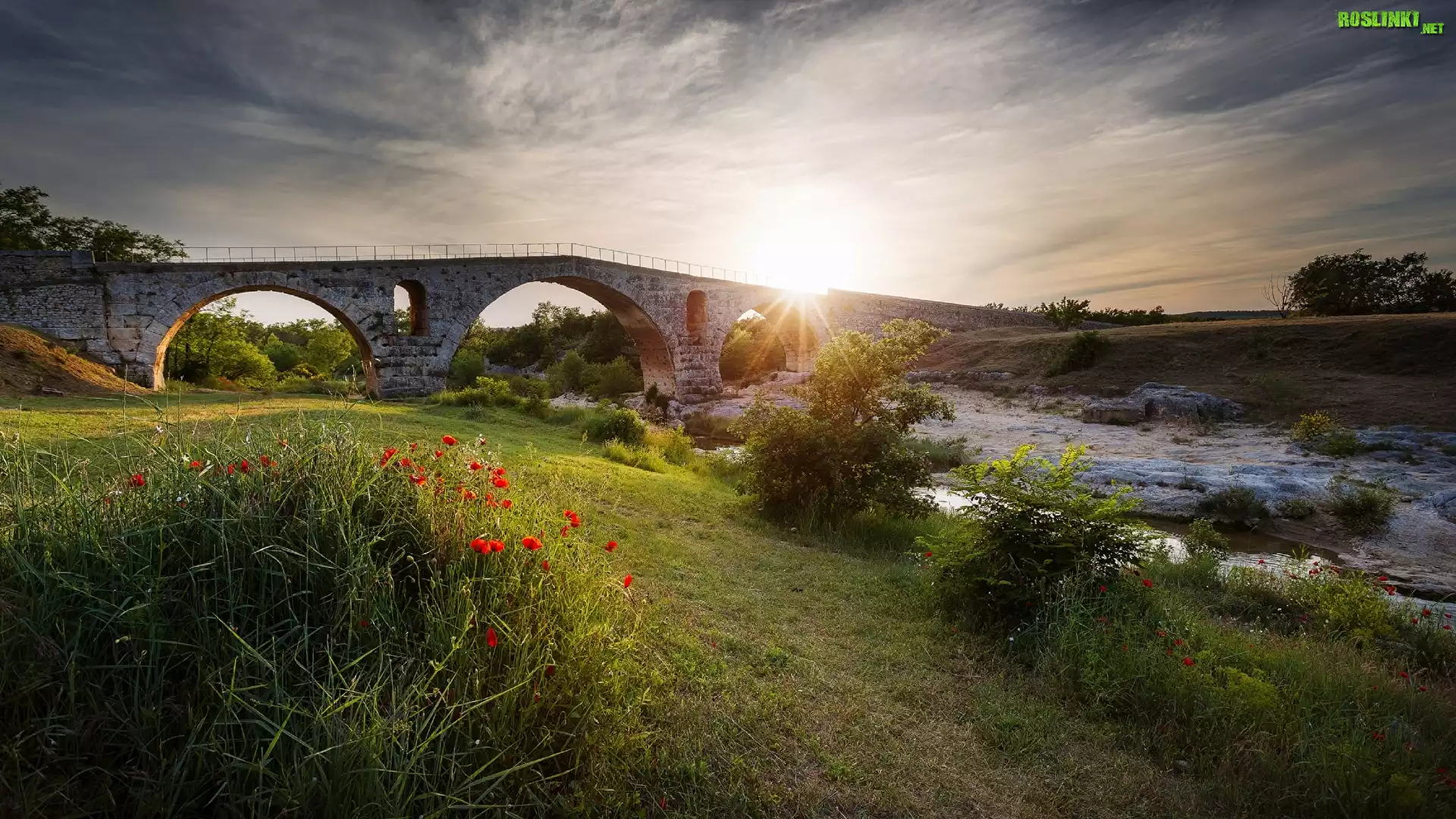 Rośliny: Wschód słońca, Rzeka, Kamienny, Most, Trawa, Maki, Krzewy