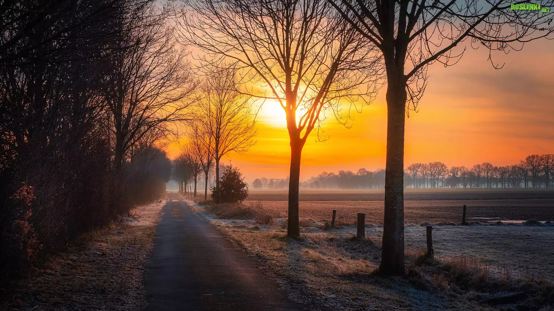 Rośliny: Droga, Jesień, Las, Drzewa, Gałęzie, Mgła, Zachód słońca