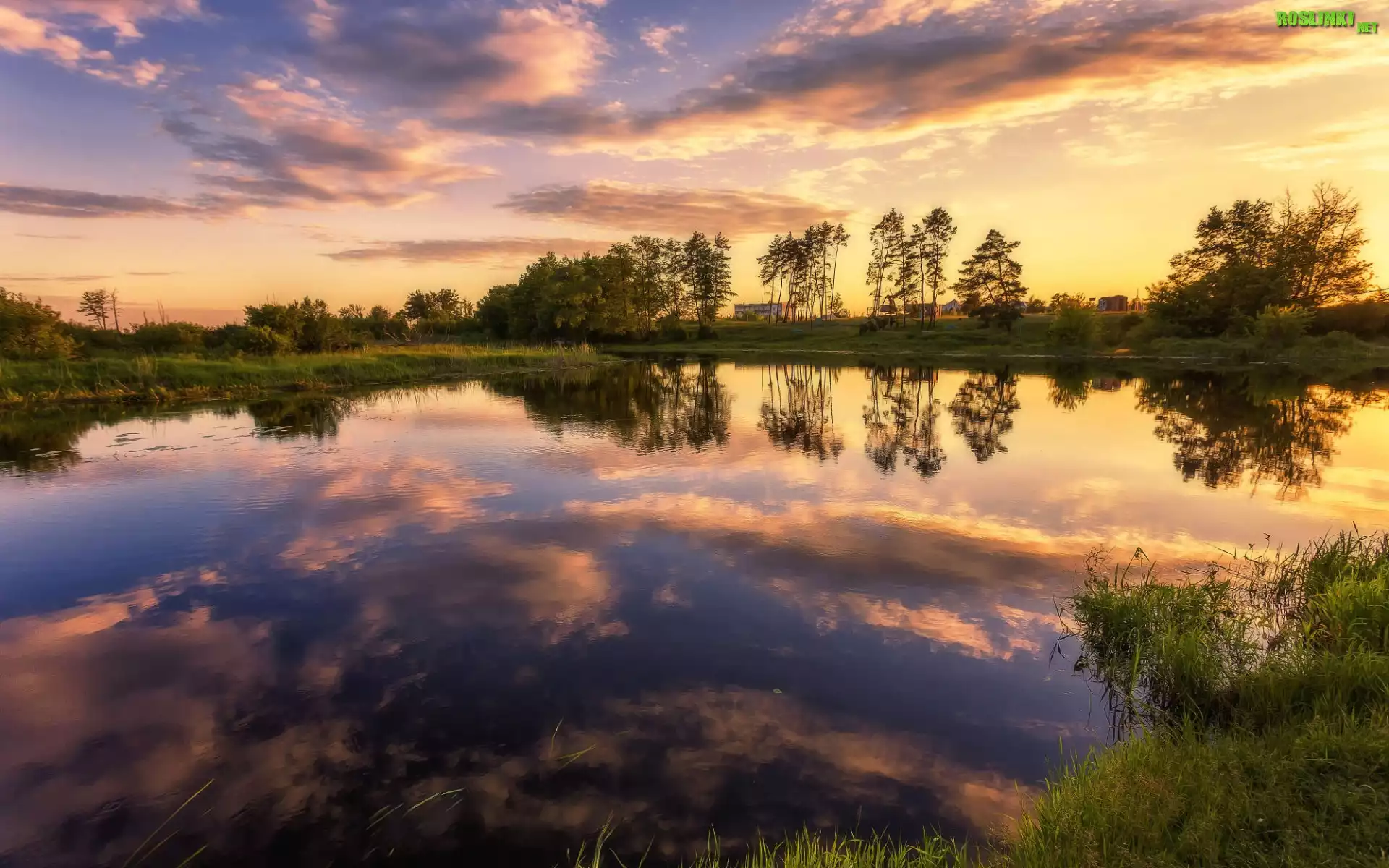 Rośliny: Zachód słońca, Rzeka, Drzewa, Chmury, Odbicie, Trawa, Lato