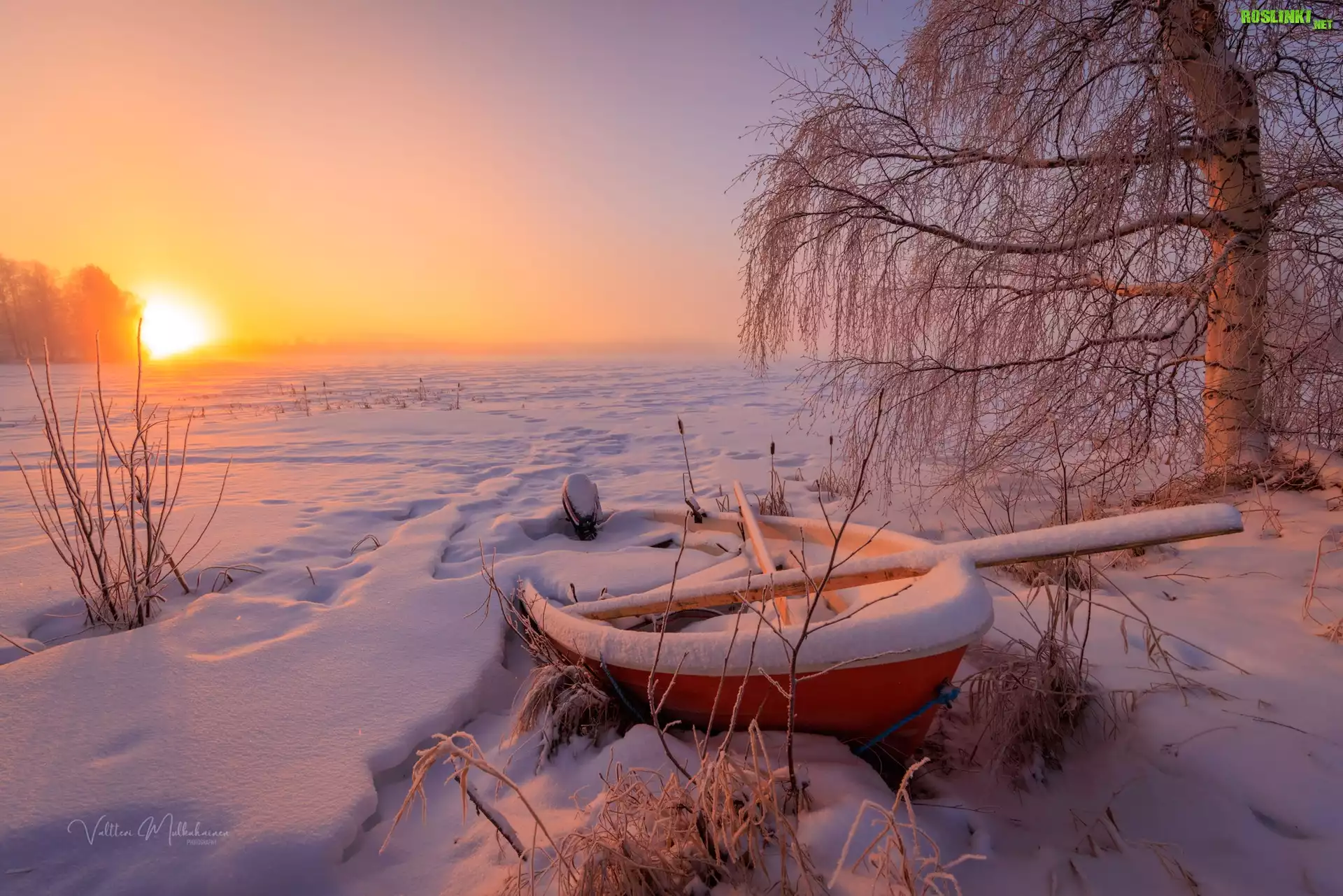 Rośliny: Zima, Śnieg, Łódka, Drzewo, Brzoza, Rośliny, Zachód słońca