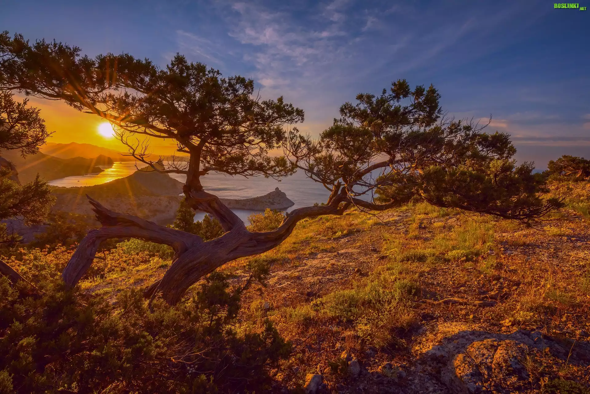 Rośliny: Ukraina, Krym, Rezerwat botaniczny Nowy Świat, Wybrzeże, Sosna, Zachód słońca