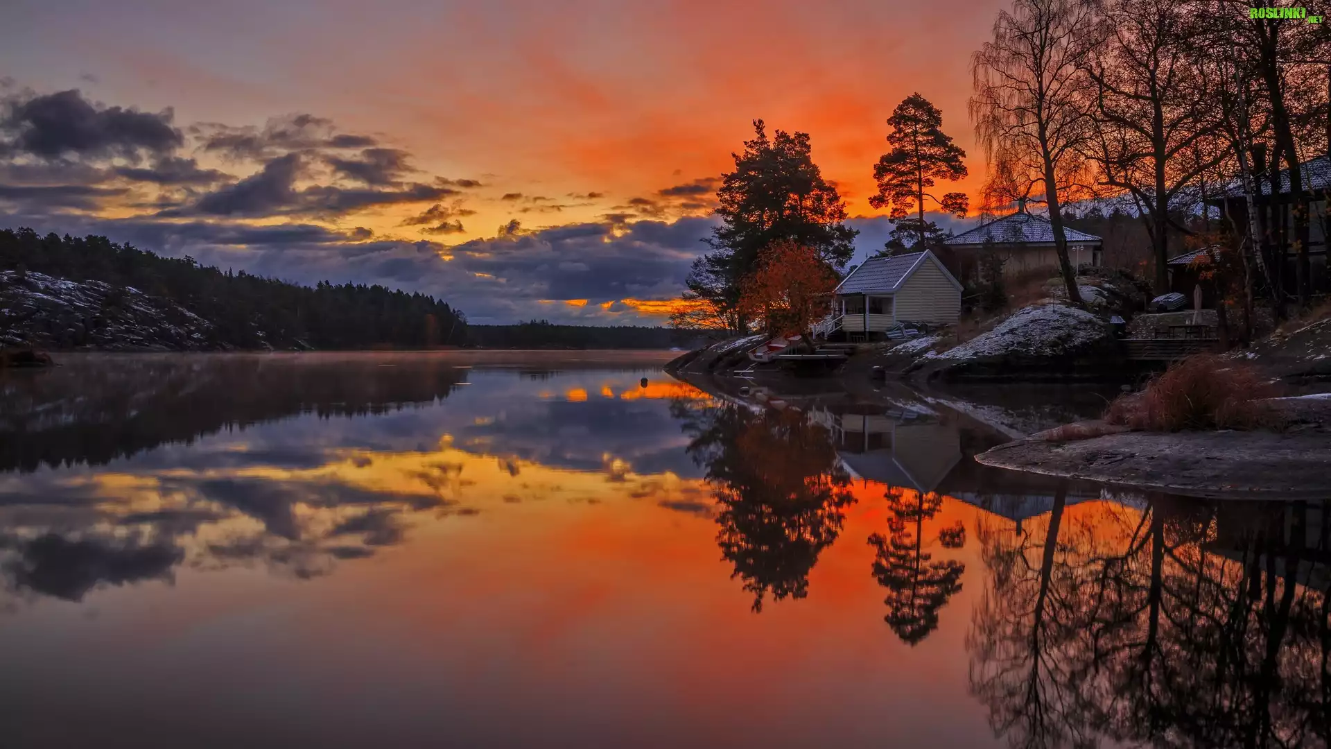 Rośliny: Zachód słońca, Jezioro, Chmury, Dom, Łódka, Drzewa, Odbicie