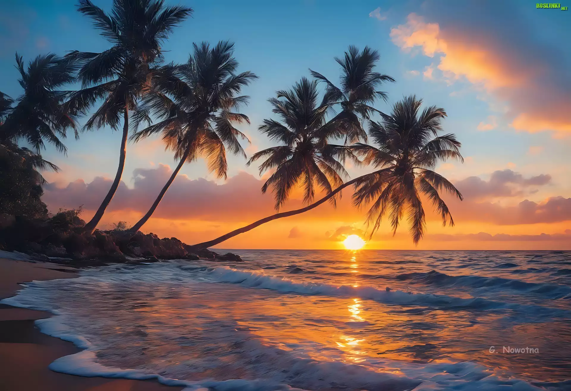 Rośliny: Zachód Słońca, Palmy, Morze, Grafika
