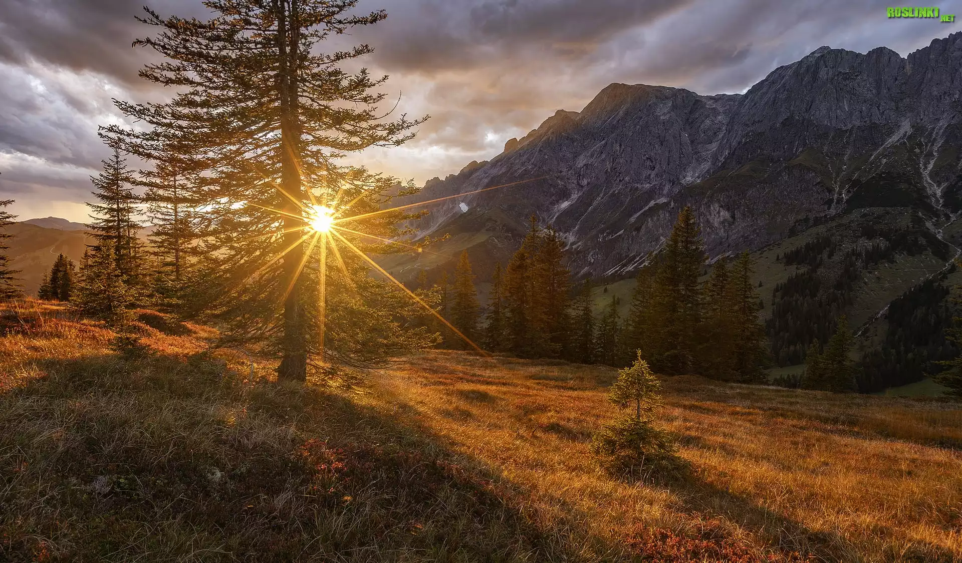 Rośliny: Promienie słońca, Drzewa, Góry Hochkonig, Salzburg, Austria