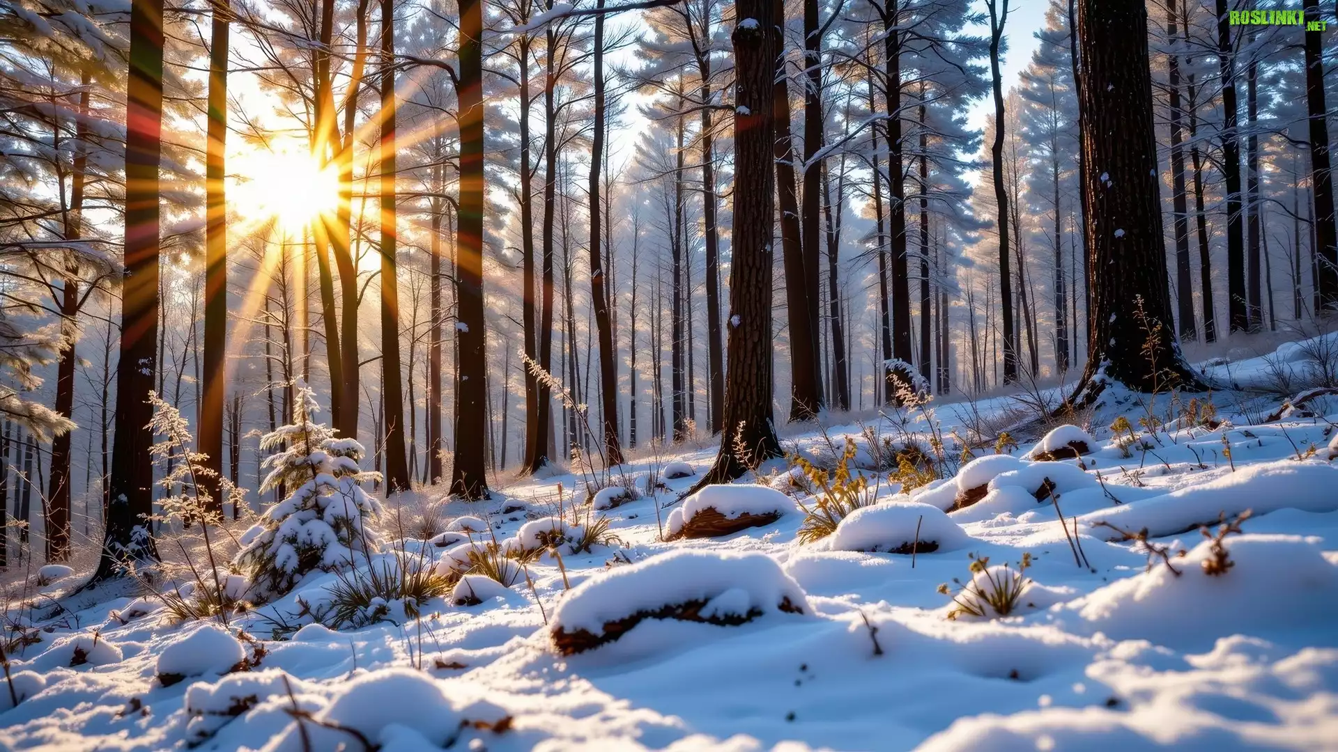 Rośliny: Zima, Las, Promienie słońca, Ośnieżone, Rośliny, Drzewa