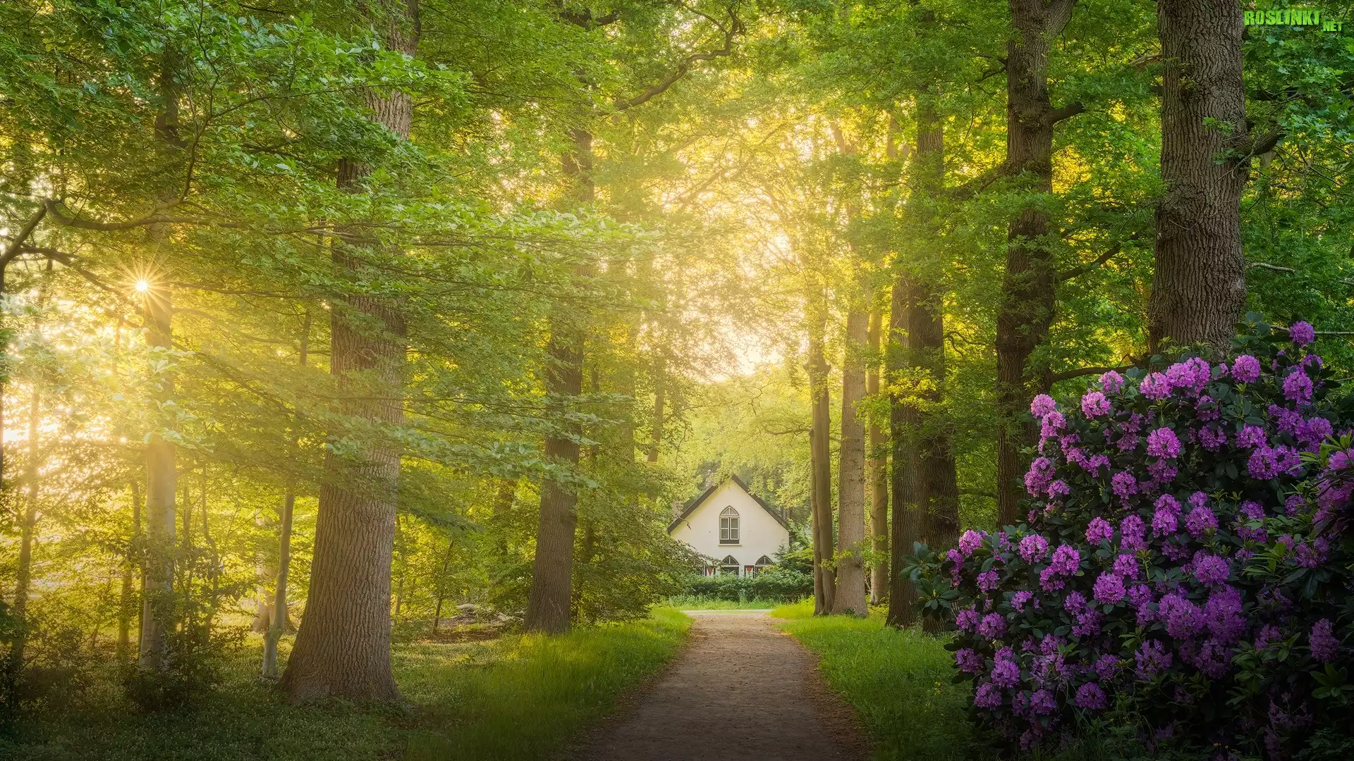 Promienie słońca, Droga, Drzewa, Dom, Krzew, Rododendron