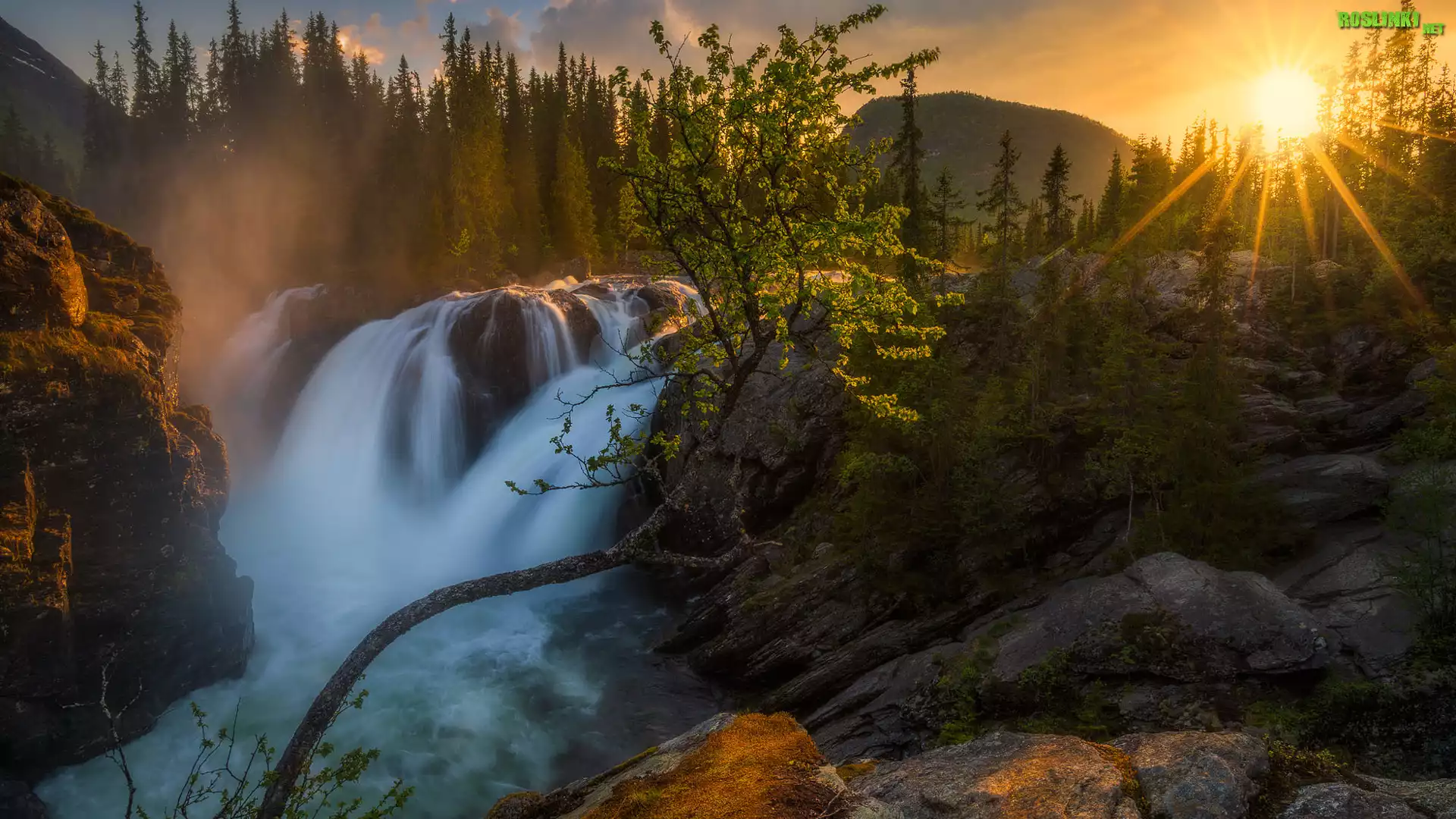 Rośliny: Norwegia, Gmina Hemsedal, Wodospad Rjukandefossen, Skały, Góry, Drzewa, Promienie słońca
