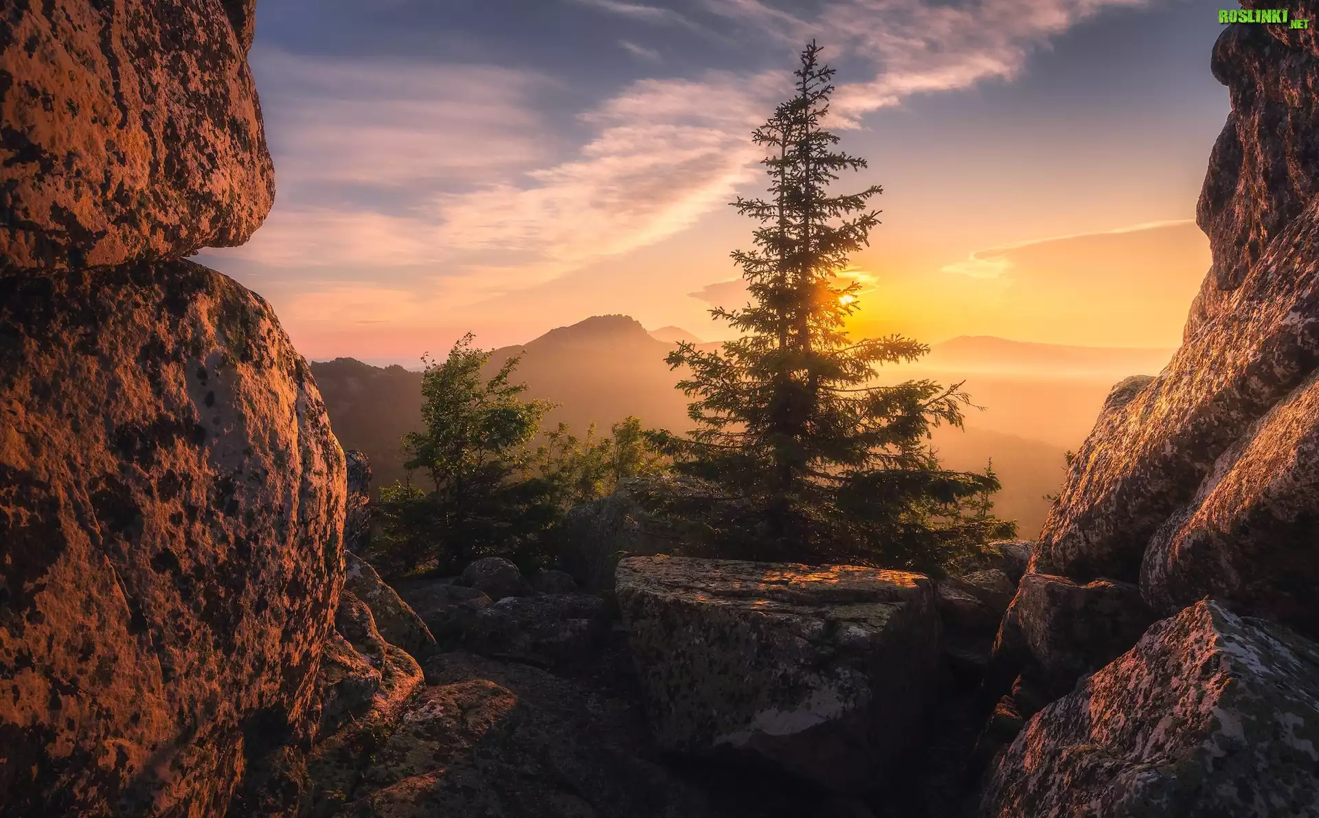 Rośliny: Wschód słońca, Skały, Góry, Drzewa