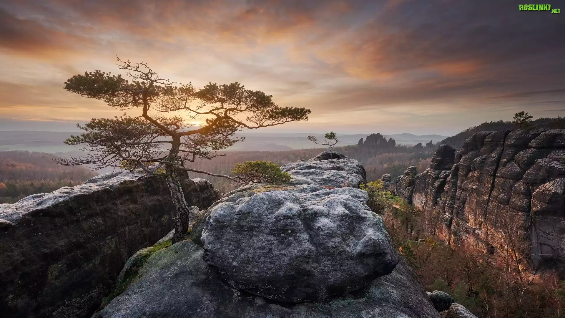 Rośliny: Zachód słońca, Skały, Drzewo, Sosna