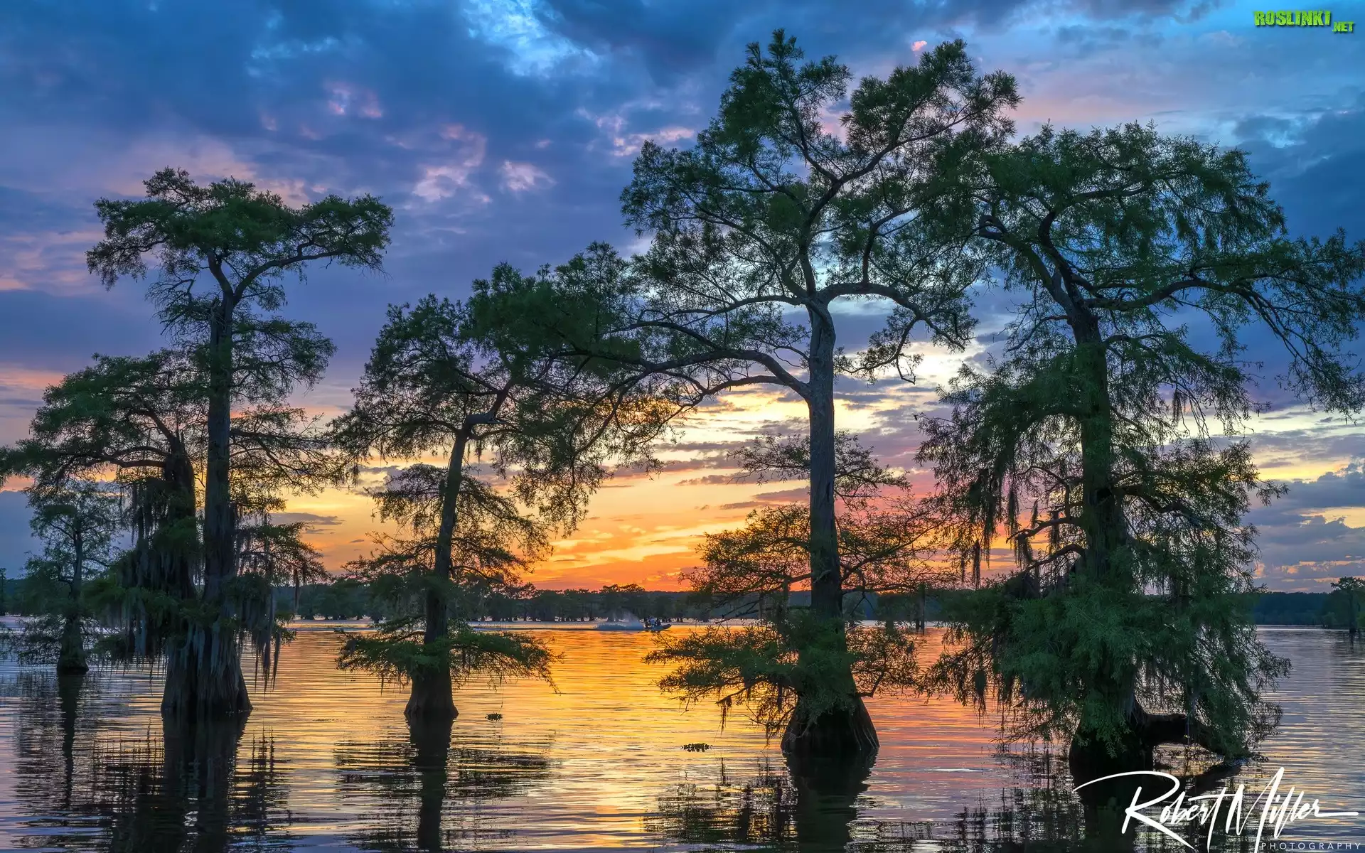 Rośliny: Jezioro, Caddo Lake, Drzewa, Cyprysy, Zachód słońca, Stan Teksas, Stany Zjednoczone