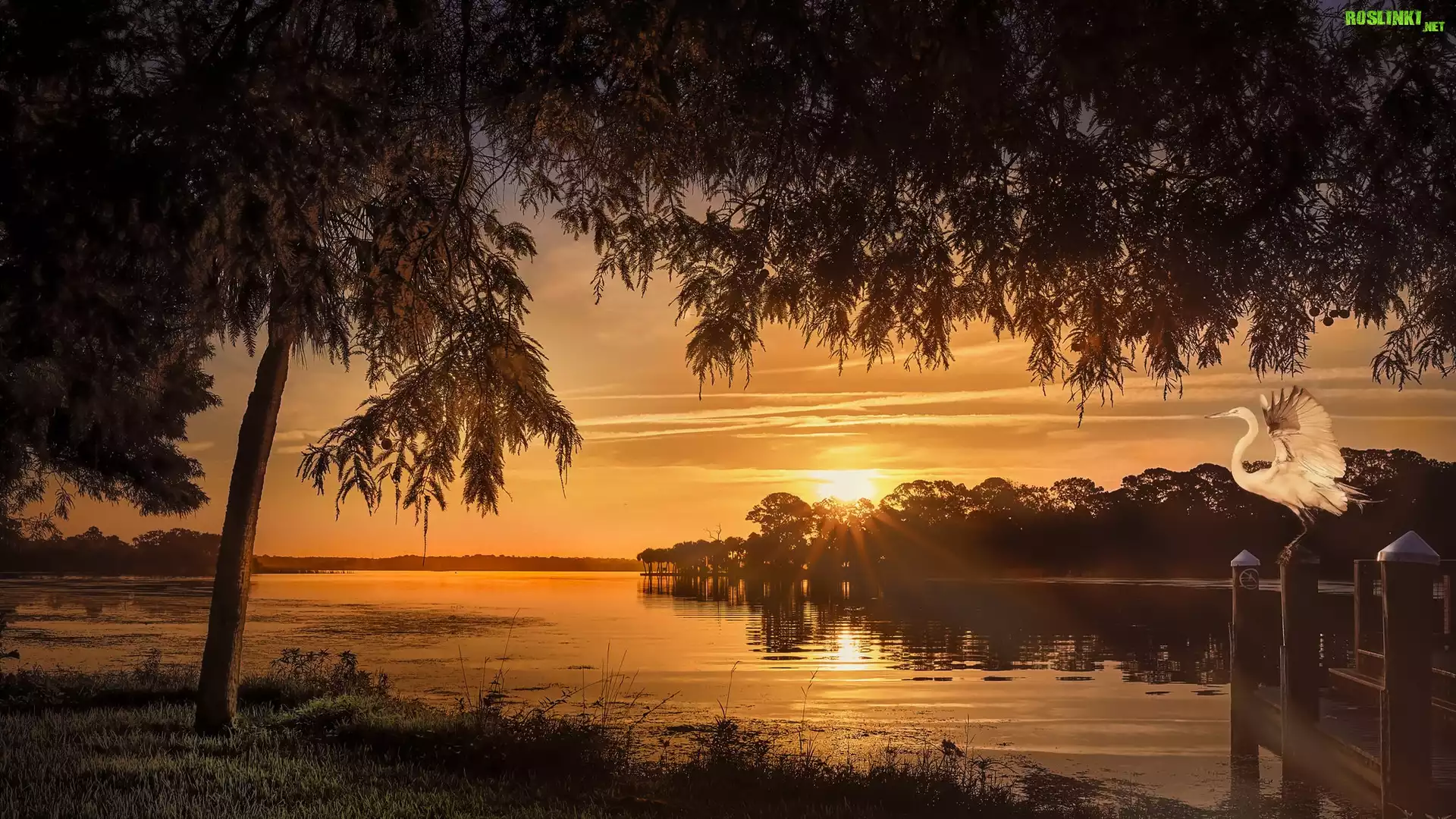 Rośliny: Drzewa, Jezioro, Wieczór, Pomost, Ptak, Chmury, Zachód słońca