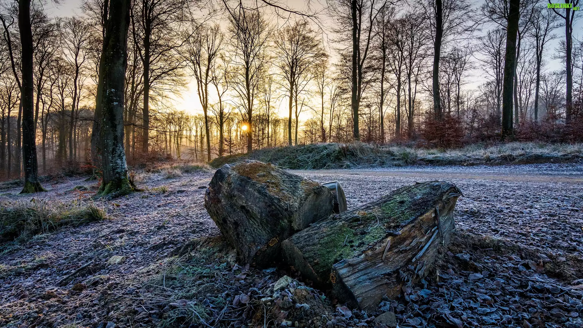 Rośliny: Wschód słońca, Las, Drzewa, Szron, Kłody, Droga