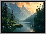 Góry, Jezioro, Wschód słońca, Mgła, Drzewa, AI