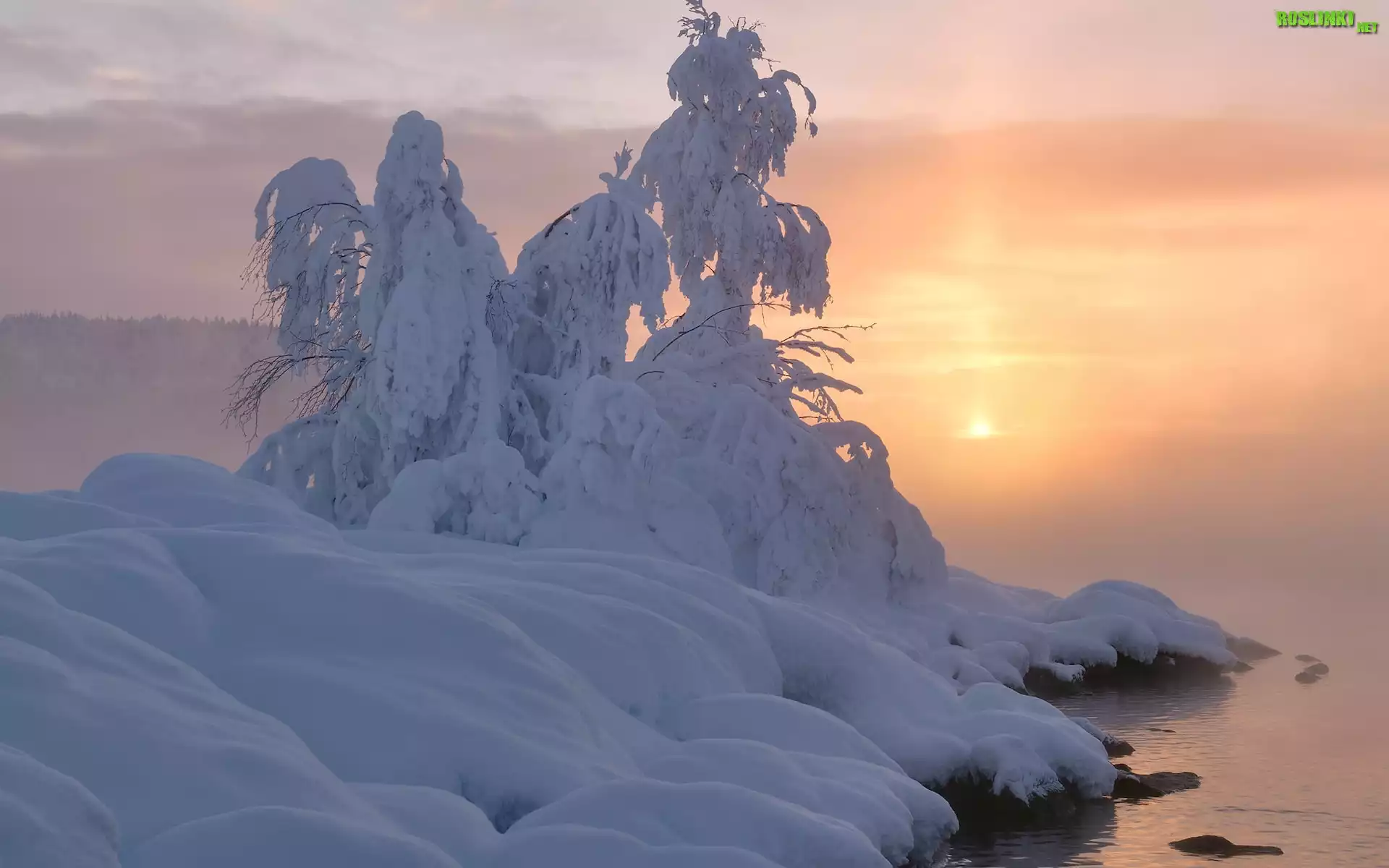 Rośliny: Wschód słońca, Zima, Śnieg, Zaspy, Drzewo, Ośnieżone