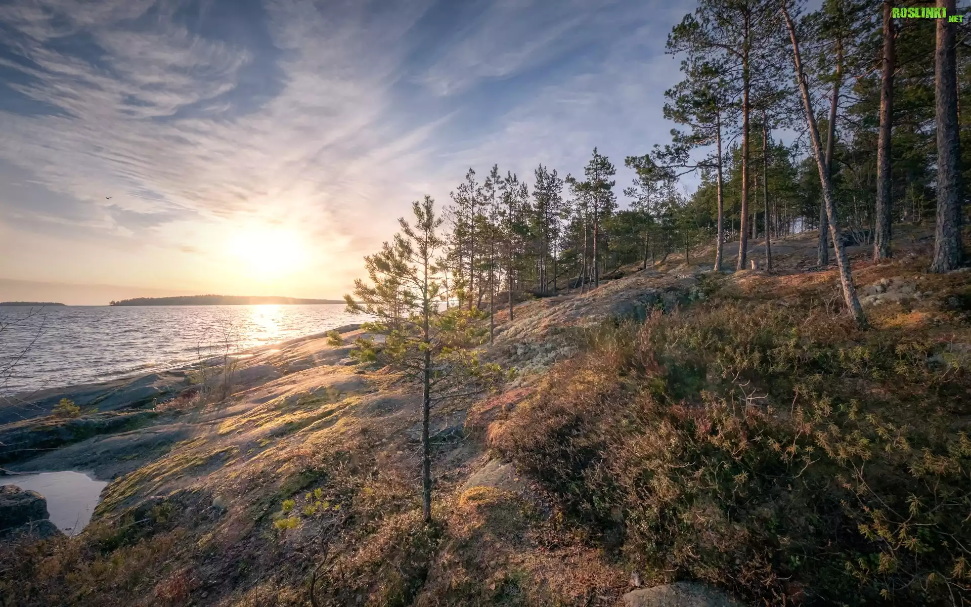 Rośliny: Wschód słońca, Jezioro Ładoga, Skały, Drzewa, Rosja