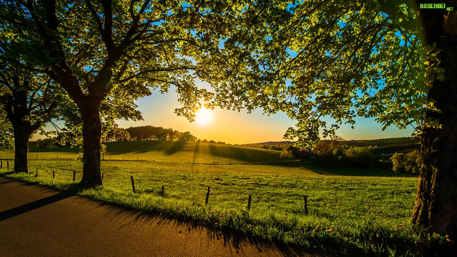 Rośliny: Wschód słońca, Wzgórze, Drzewa, Trawa, Droga, Roślinność