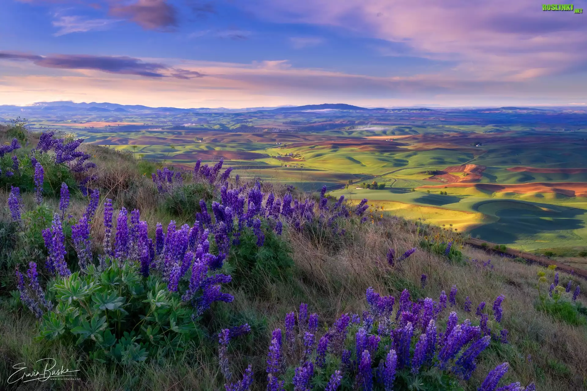 Stany Zjednoczone, Waszyngton, Park stanowy Steptoe Butte, Wzgórza, Palouse, Kwiaty, Łubin, Trawa, Dolina, Pola, Łąki, Wschód słońca |