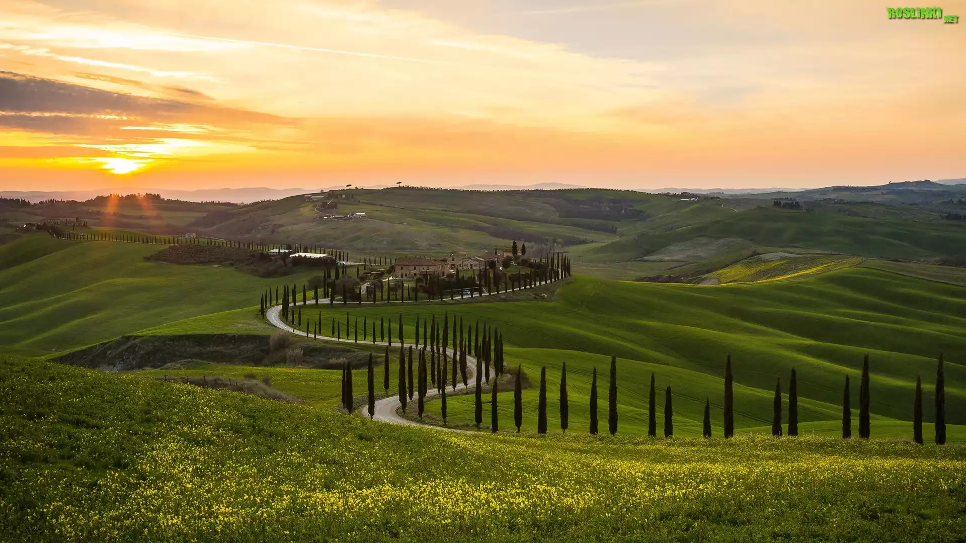 Rośliny: Włochy, Toskania, Wzgórza, Drzewa, Domy, Droga, Cyprysy, Wschód słońca