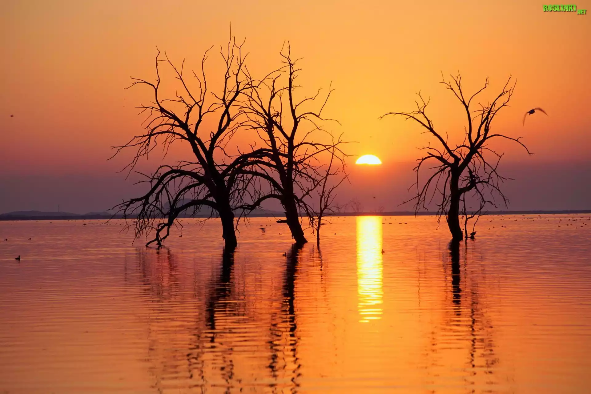Rośliny: Zachód, Słońca, Jezioro, Trzy, Samotne, Suche, Drzewa