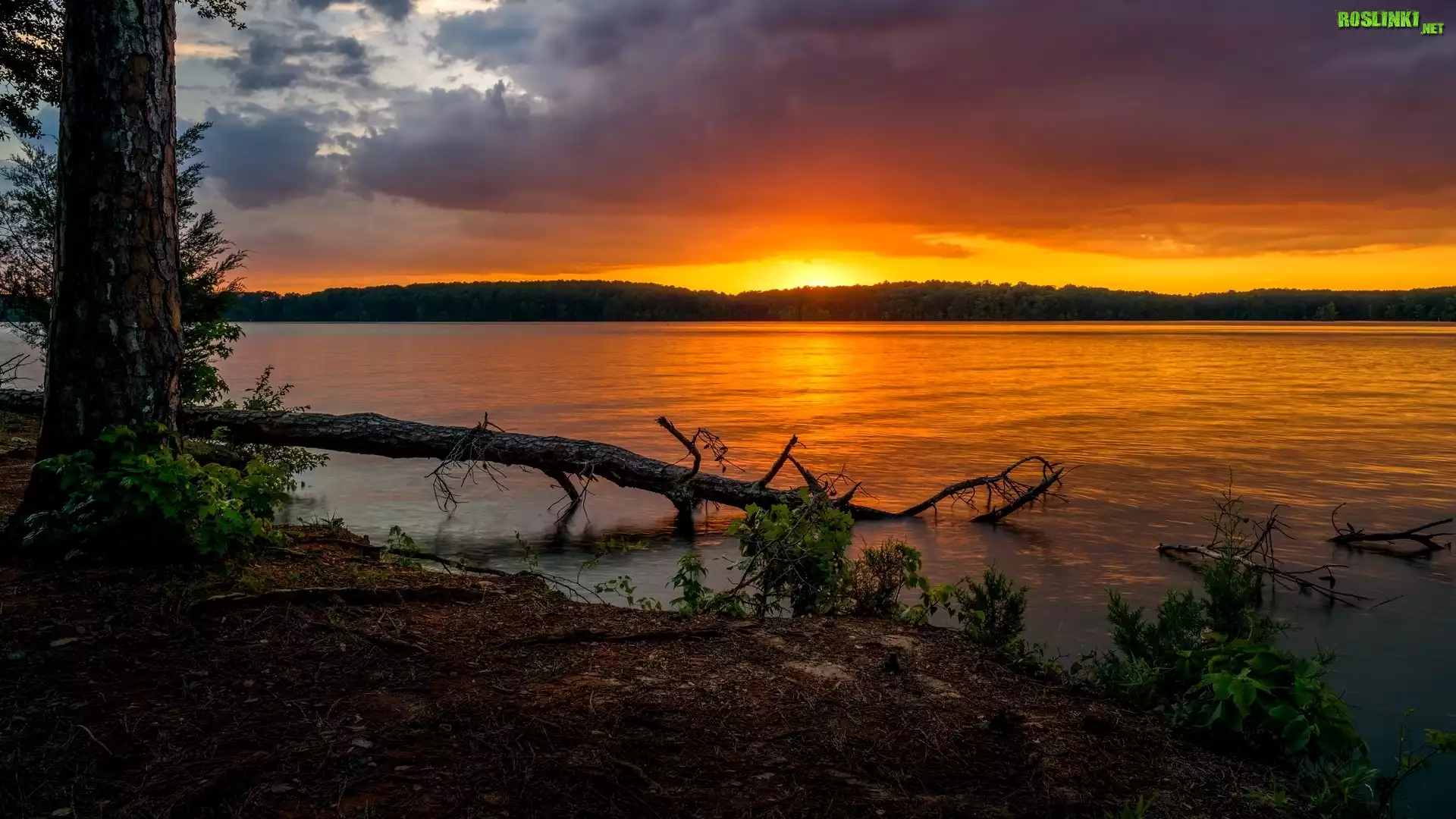 Rośliny: Zachód słońca, Jezioro, Chmury, Drzewa, Powalone, Drzewo
