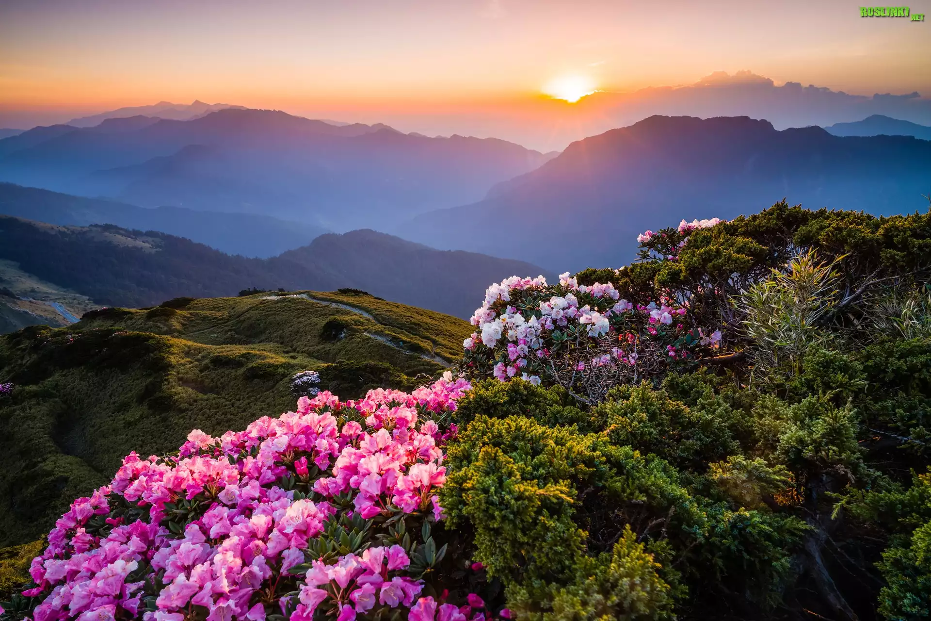 Rośliny: Zachód słońca, Różanecznik, Azalie, Wzgórza, Góry, Mgła