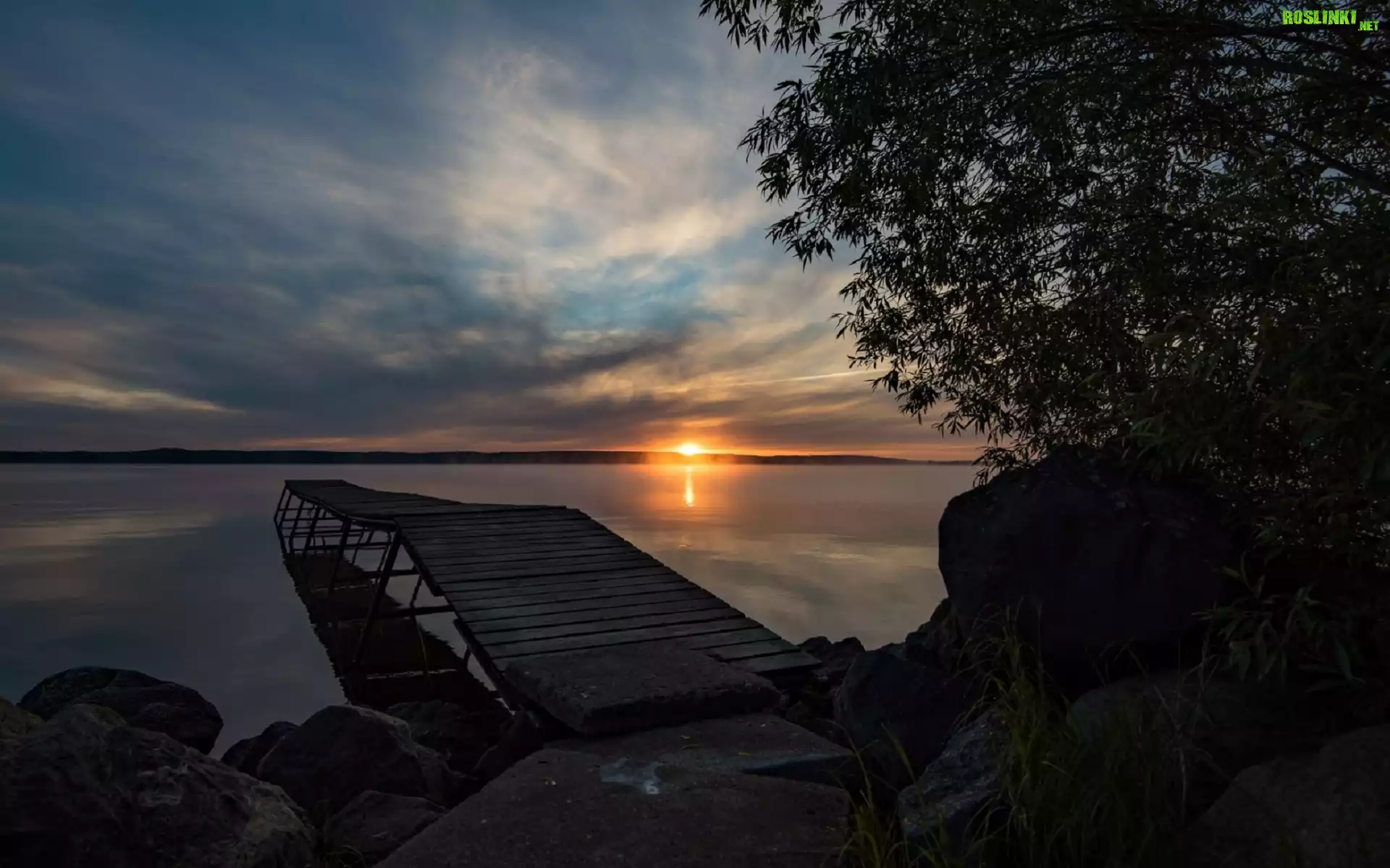 Rośliny: Zachód, Słońca, Jezioro, Pomost, Kamienie, Drzewo Molo