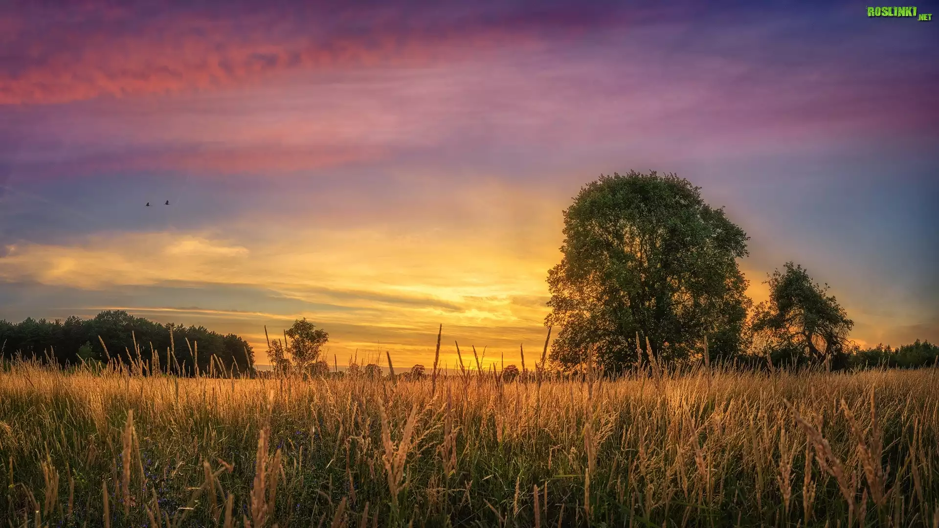 Rośliny: Zachód słońca, Trawa, Kwiaty, Drzewo, Ptaki, Niebo