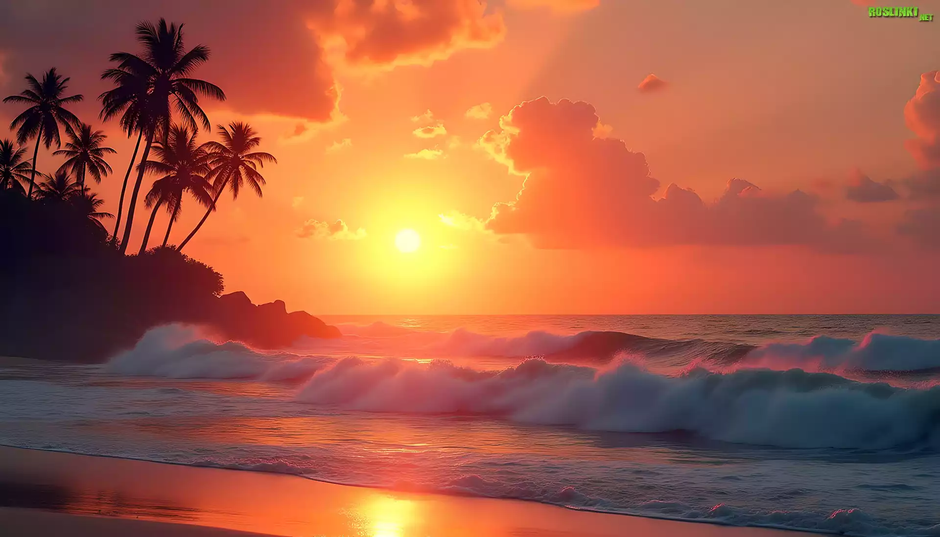 Rośliny: Morze, Palmy, Zachód słońca, Niebo, Fale, Grafika