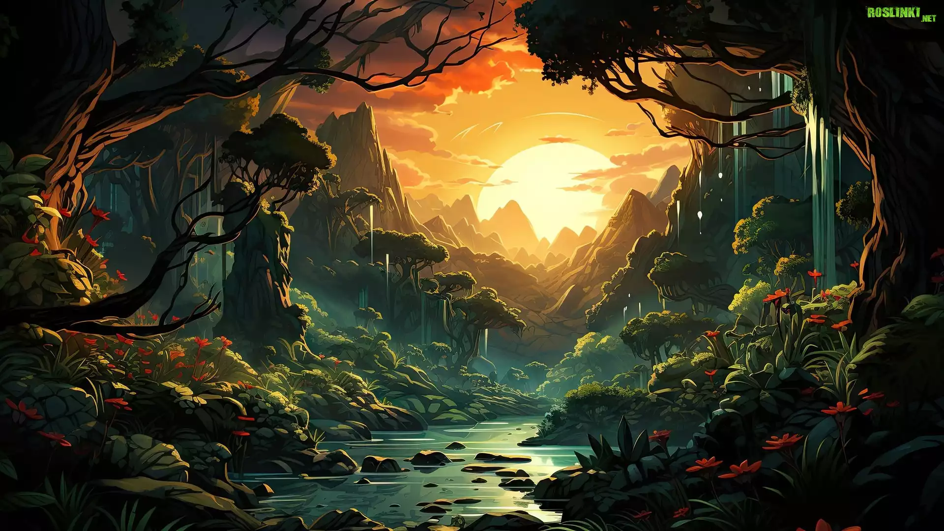 Rośliny: Grafika, Rzeka, Drzewa, Słońce, Kwiaty, Rośliny, Góry