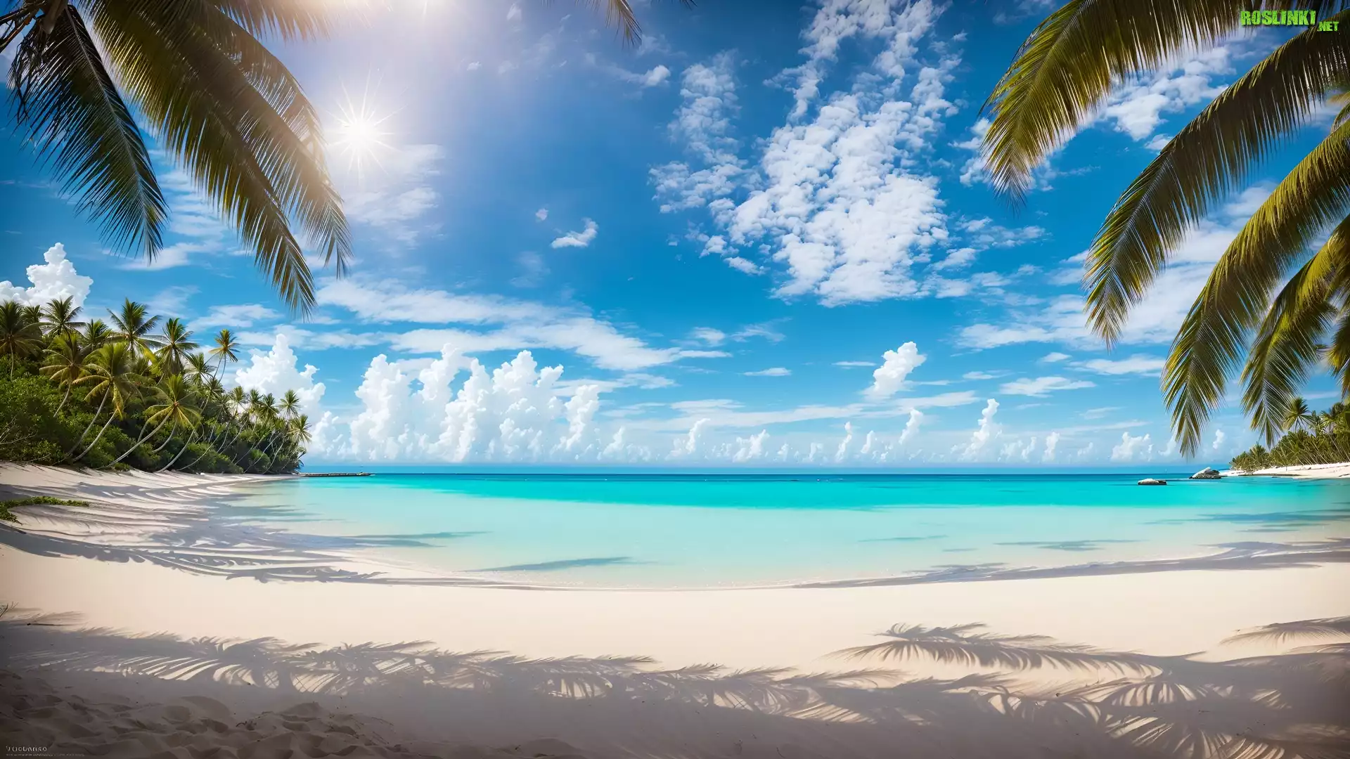 Rośliny: Plaża, Palmy, Morze, Słońce, Tropiki, Niebo, Grafika