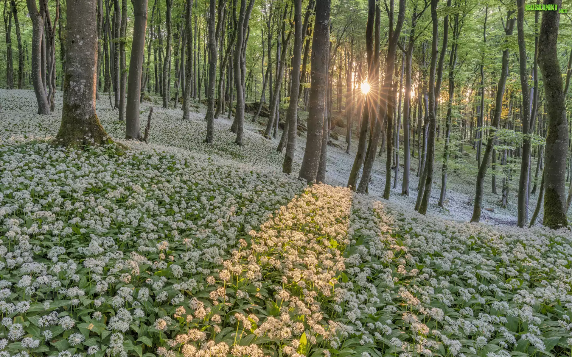 Rośliny: Wiosna, Las, Drzewa, Kwiaty, Czosnek niedżwiedzi, Promienie słoneczne