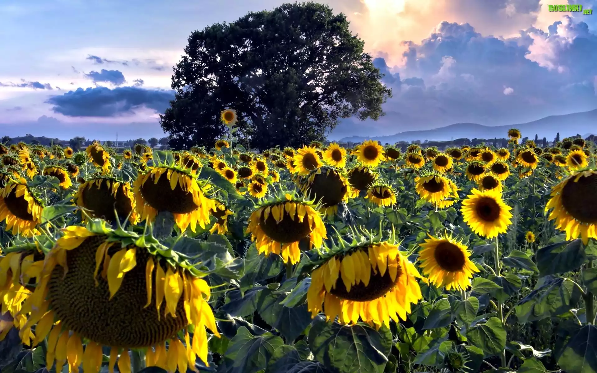 Rośliny: Słoneczniki, Pole, Drzewo, Chmury