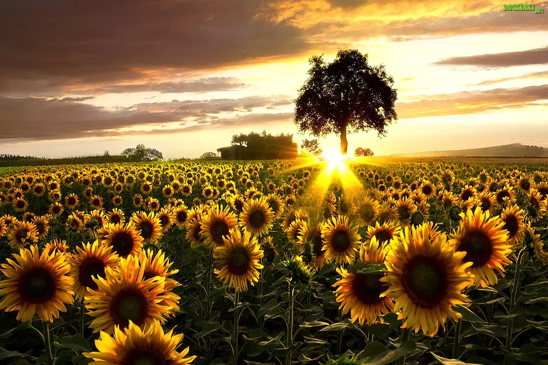Słoneczniki, Zachód Słońca, Drzewo, Promienie