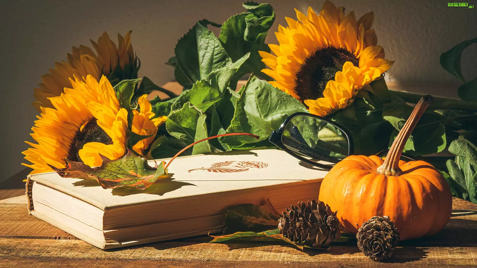Rośliny: Kwiaty, Słoneczniki, Książka, Dynia, Okulary, Szyszki, Liście, Kompozycja
