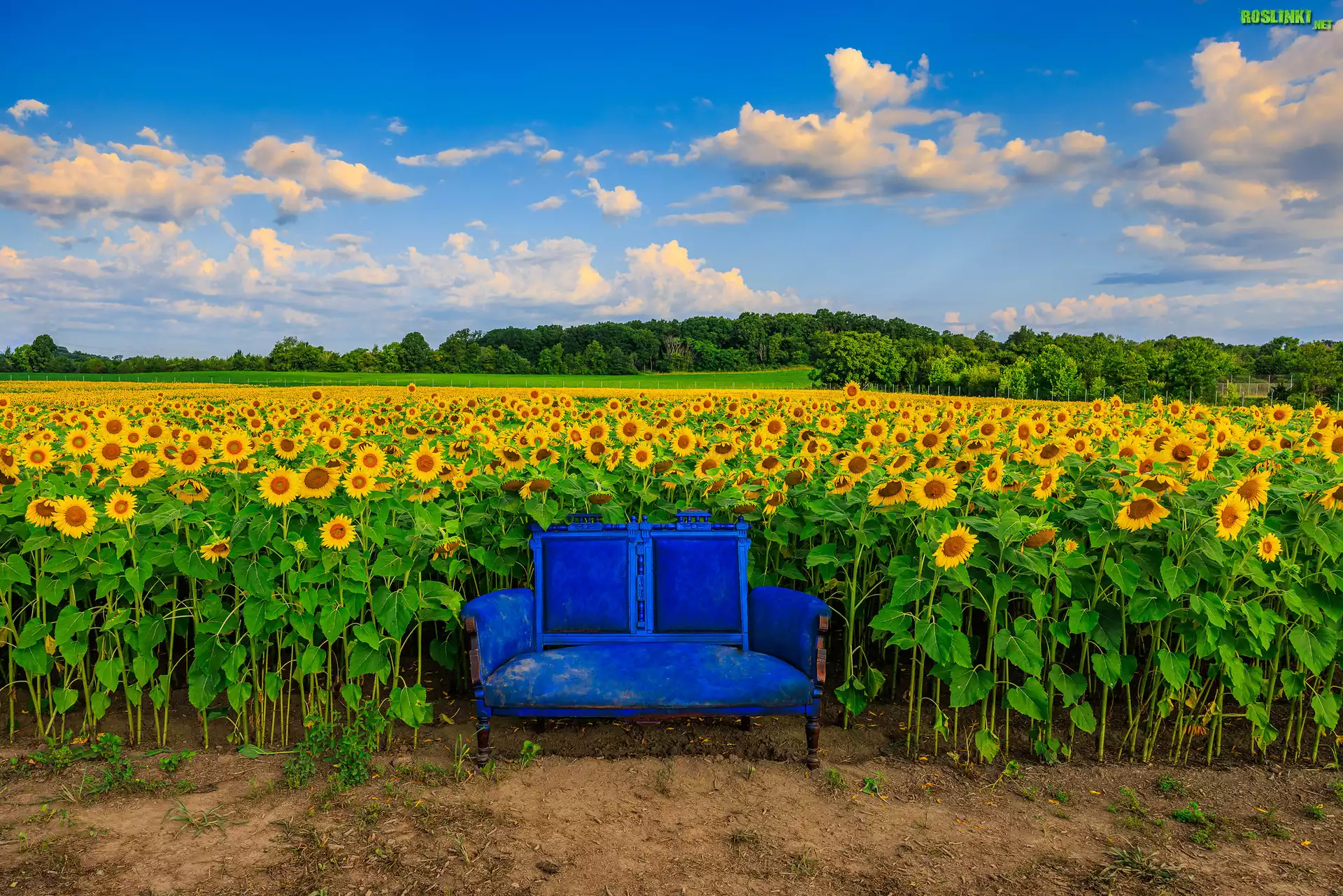 Rośliny: Pole, Słoneczniki, Niebieska, Kanapa, Niebo