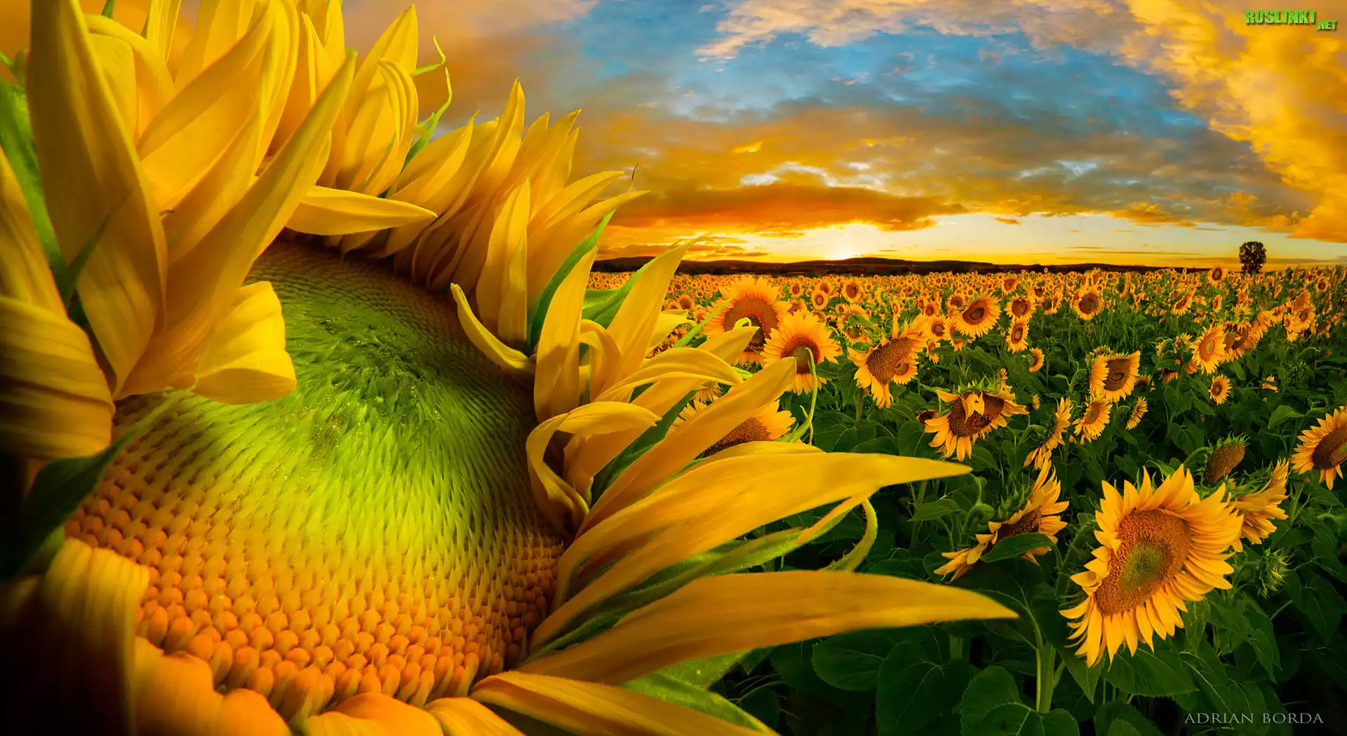 Rośliny: Słoneczniki, Zachód słońca, Pole, Chmury