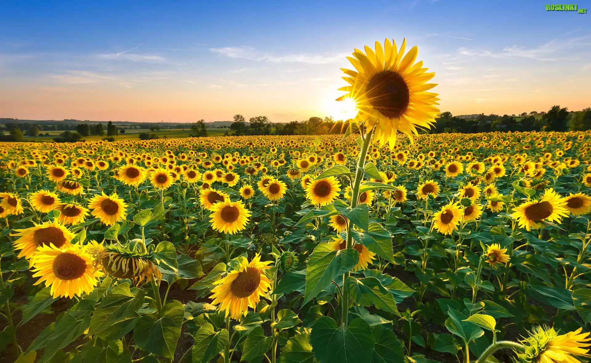 Rośliny: Słoneczniki, Pole, Wschód słońca, Drzewa