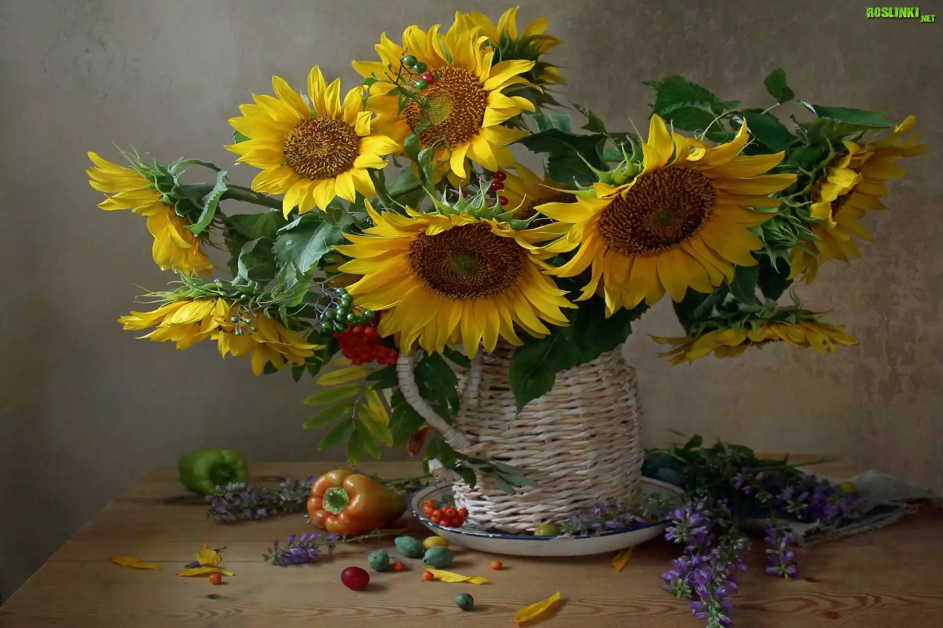 Rośliny: Kwiaty, Słoneczniki, Wiklinowy, Dzban, Kompozycja