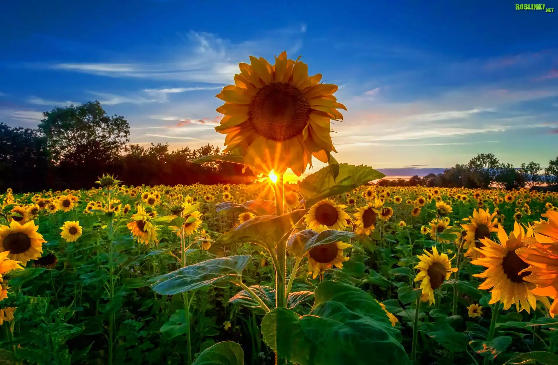 Rośliny: Słoneczniki, Lato, Zachód Słońca
